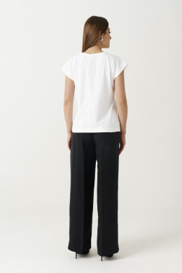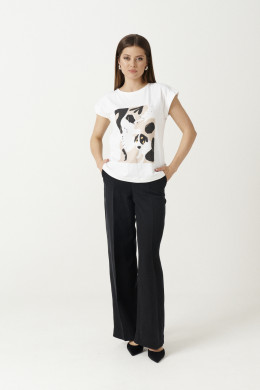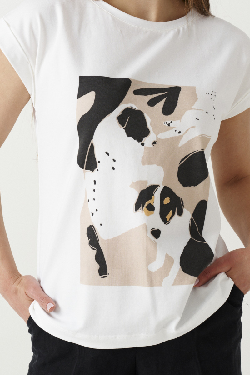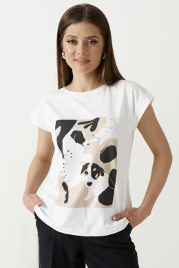 Джемпер женский из трикотажного полотна (хлопок) для повседневной носки. Горловина круглая, линия плеча слегка спущена пройма оформлена манжетой. Джемпер прилегающий, длиной до середины бедра. На передней части изделия дизайнерский принт.