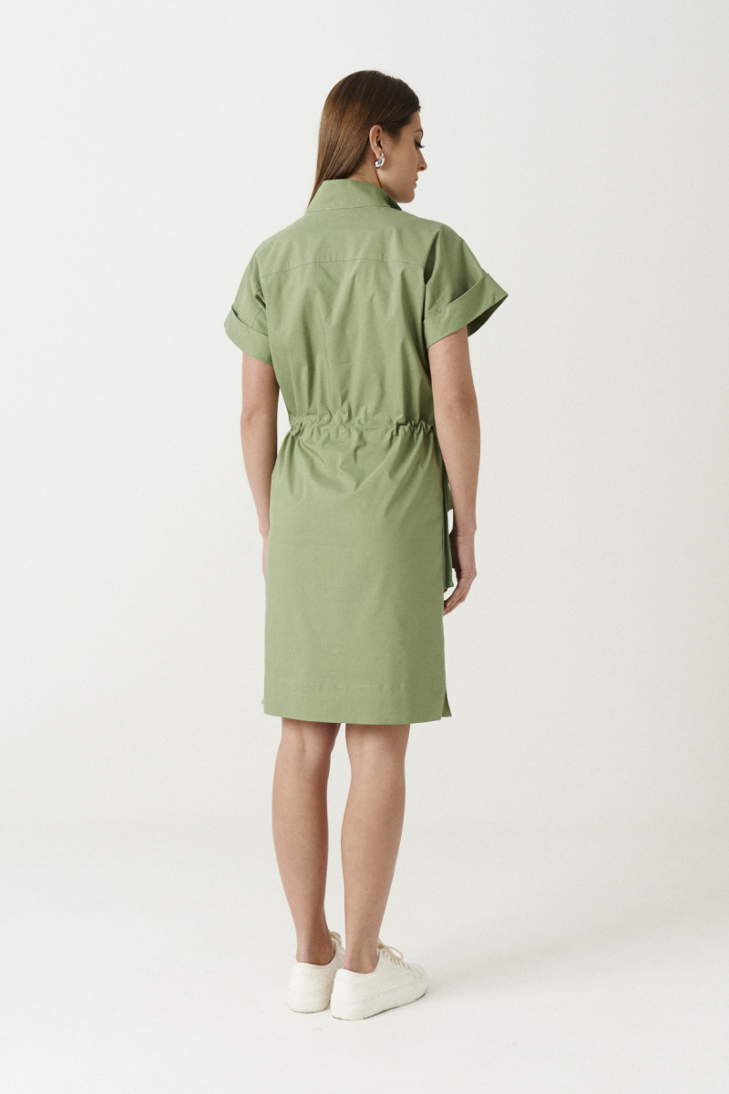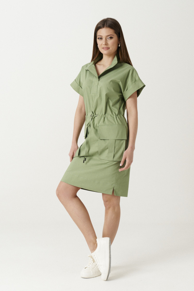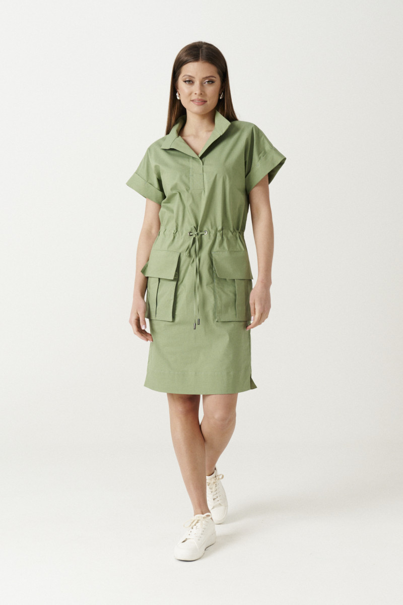 Платье женское из хлопковой ткани для повседневной носки. Платье прямого силуэта с коротким цельнокроеным рукавом оформленым отложной манжетой. Платье с кулисой по талии и разрезами в боковых швах от низа изделия. По переду накладные карманы с клапаном. По спинке отрезная кокетка.