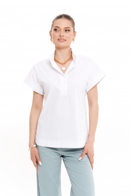Блуза женская из хлопковой ткани для повседневной носки. Блуза прямого силуэта с коротким цельнокроеным рукавом оформленым отложной манжетой. По горловине имеется притачная стойка. Горловина оформлена декоративной планкой с декоративными закрепками. По спинке отрезная кокетка, от кокетки идут складки.