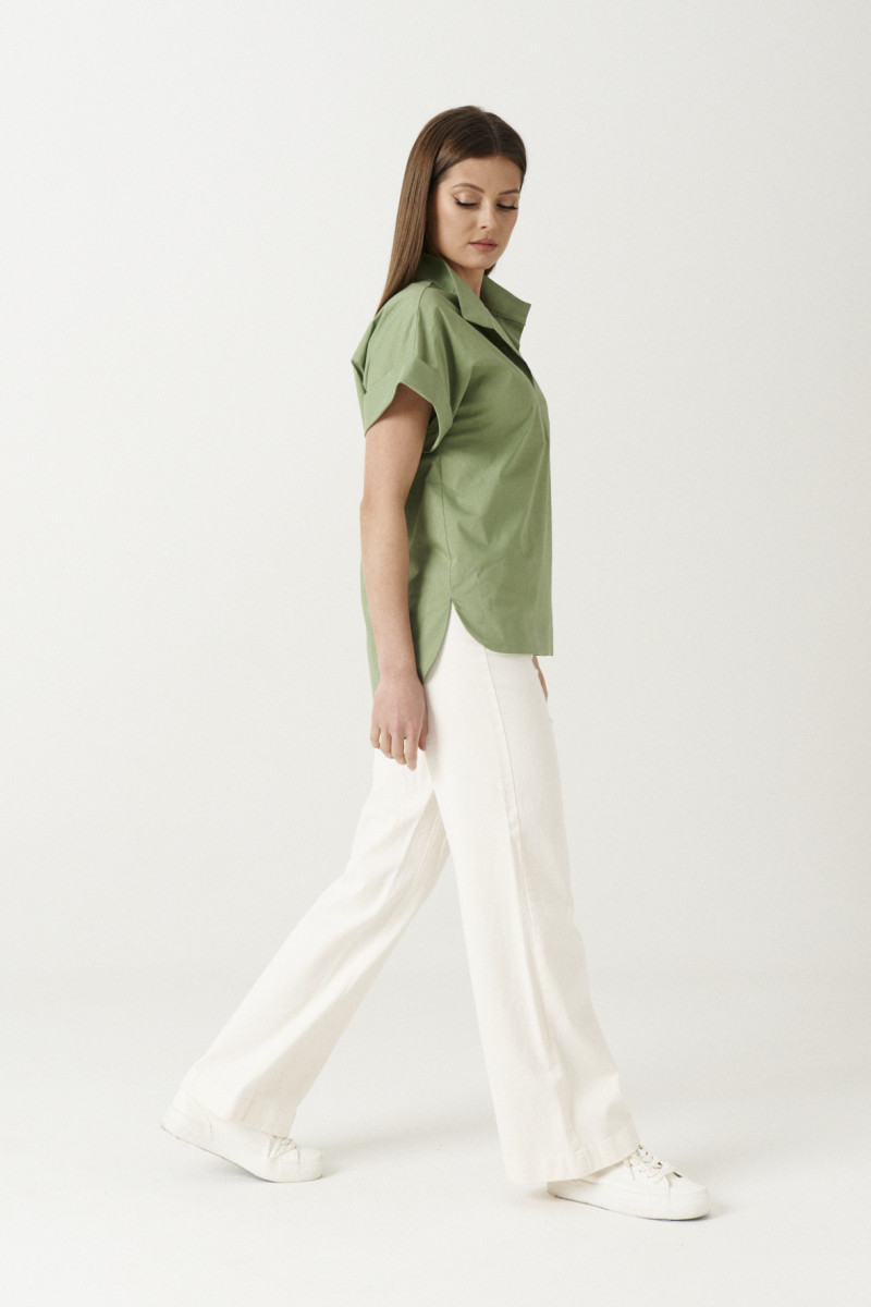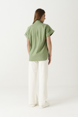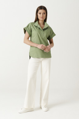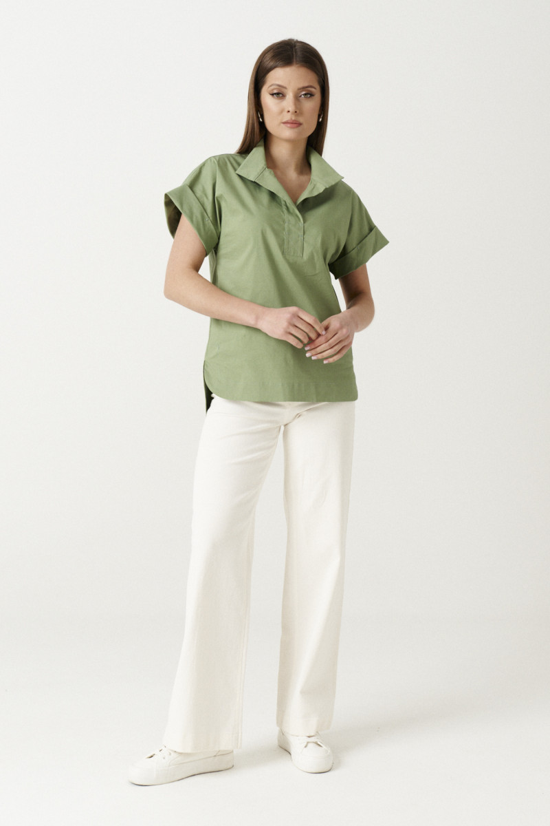 Блуза женская из хлопковой ткани для повседневной носки. Блуза прямого силуэта с коротким цельнокроеным рукавом оформленым отложной манжетой. По горловине имеется притачная стойка. Горловина оформлена декоративной планкой с декоративными закрепками. По спинке отрезная кокетка, от кокетки идут складки.