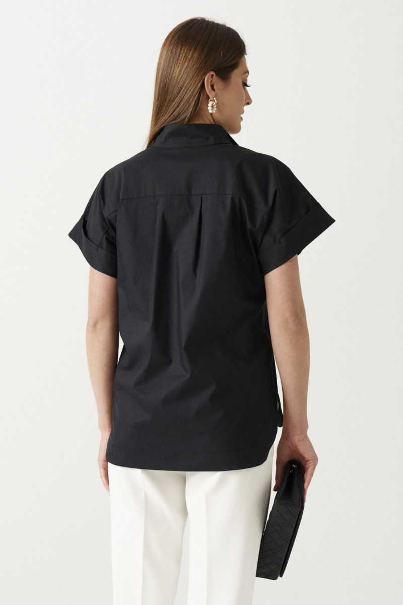 Блуза женская из хлопковой ткани для повседневной носки. Блуза прямого силуэта с коротким цельнокроеным рукавом оформленым отложной манжетой. По горловине имеется притачная стойка. Горловина оформлена декоративной планкой с декоративными закрепками. По спинке отрезная кокетка, от кокетки идут складки.