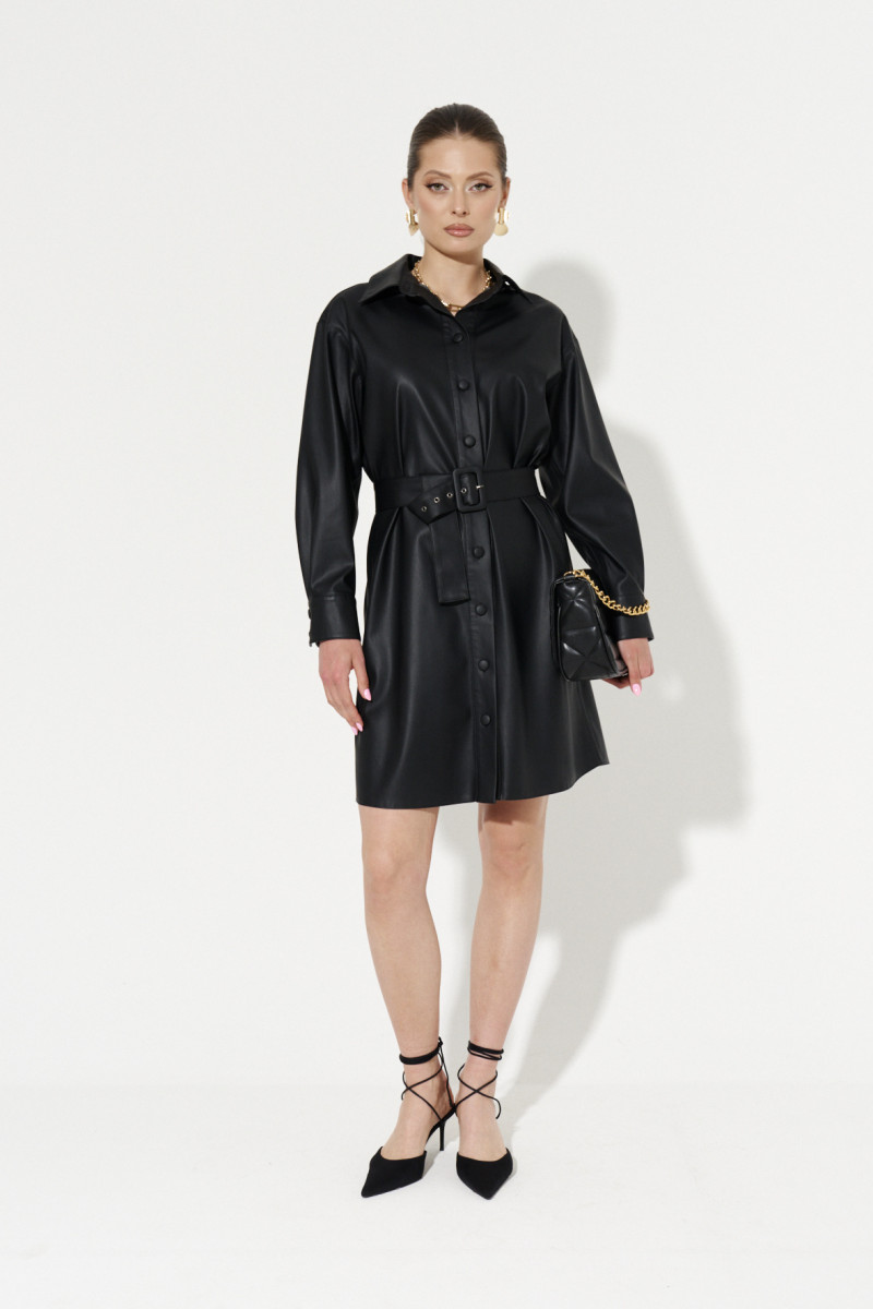 Платье женское из мягкой эко кожи для повседневной носки прямого силуэта. Перед имеет два накладных кармана с клапаном, застежка на одну обметанную петлю и одну пуговицу. Перед с цельнокроеной планкой и застежкой на девять обметанных петель и девять пуговиц, Линия плеча чуть сдвинута вперед. Низ изделия чуть скругленный. По спинке имеется кокетка. Горловина обработана рубашечным воротником с отрезной стойкой. Низ рукава обработан притачной манжетой на две обметанные петли и две пуговицы. Для придания формы в области талии имеется регулируемый пояс. Интересный вариант для любого времяпровождения, Удобное и комфортное платье станет вашим фаворитом.