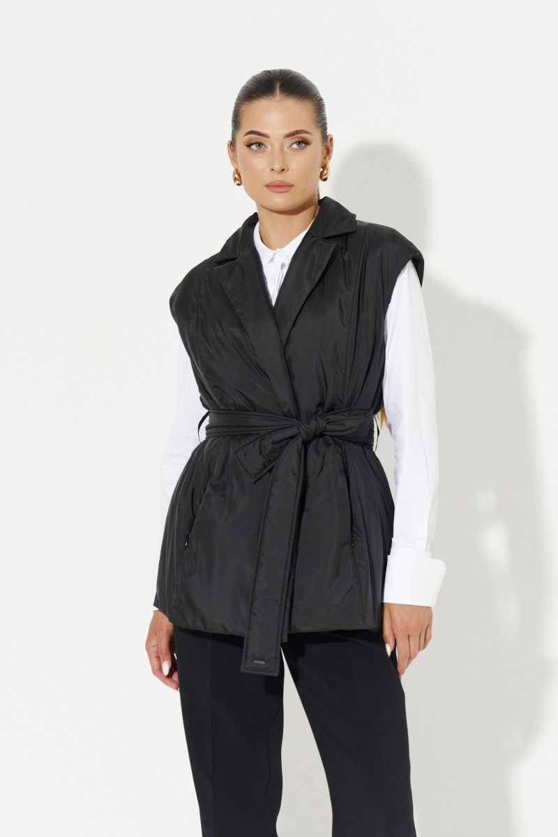 Жилет женский на синтепоне для повседневной носки полуприлегающего силуэта. Перед имеет вертикальные рельефы, идущие от плечевого среза до линии низа. По переду в рельефе имеется прорезной карман, застежка потайная на тесьму-молнию. Спинка имеет два вертикальных рельефа идущих от плечевого среза до низа изделия. Горловина обработана пиджачным воротником. Жилет не имеет рукава. Для придания формы в области талии имеется пояс. Очень красивая и элегантная жилетка, с которой вы всегда будете чувствовать себя модно и удобно.
