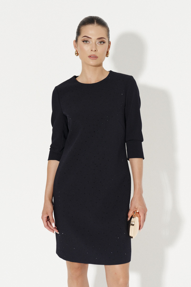 Платье женское из смесовой ткани для повседневной носки полуприлегающего силуэта. Перед имеет две нагрудные вытачки. Перед украшен мерцающими стразами. Спинка со средним швом и потайной зестежкой-молнией в шве. Рукава чуть ниже локтя и небольшими разрезами по локтевому шву. Очень изысканное платье на все случаи жизни, комфортное в носке и с безупречной посадкой по телу.