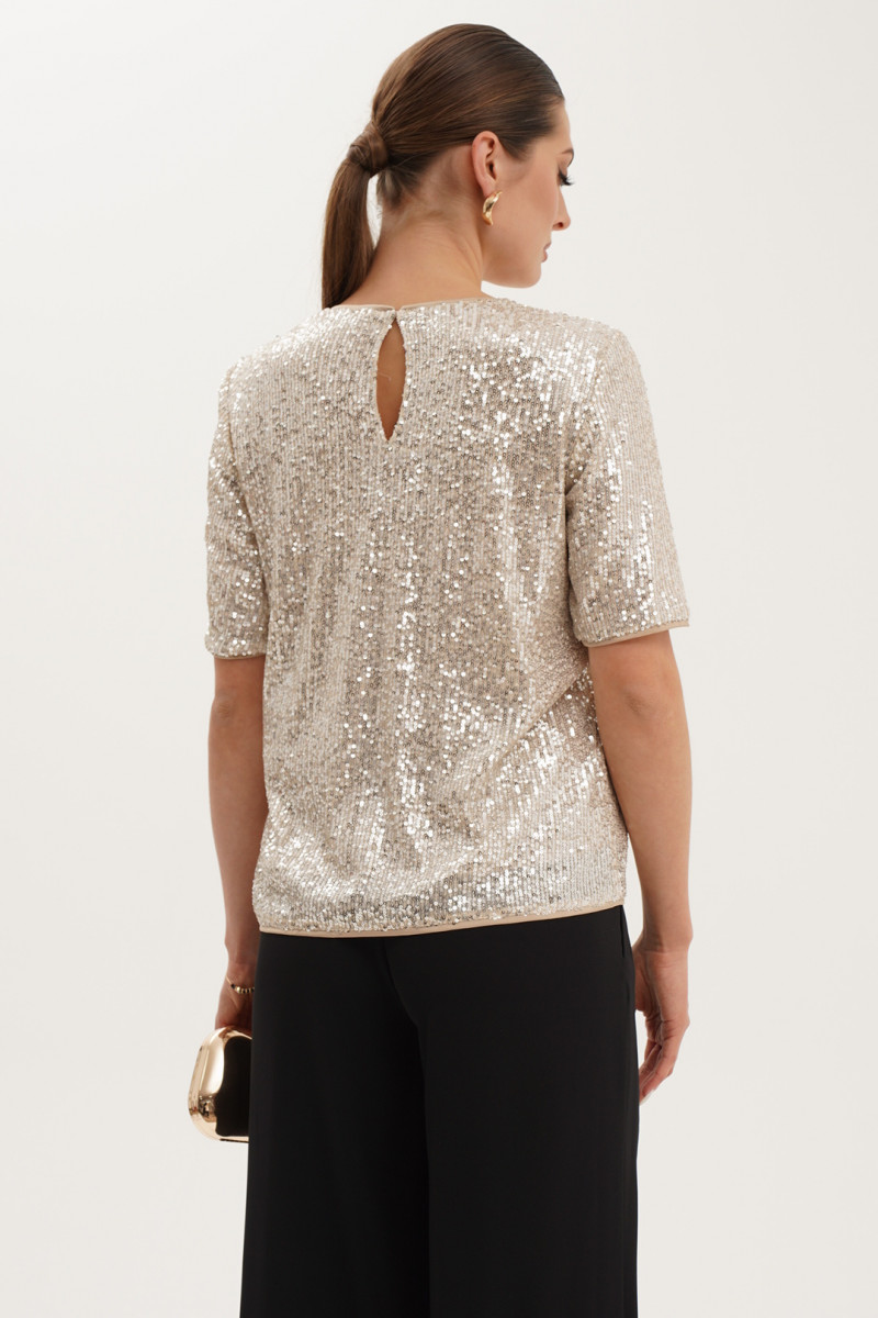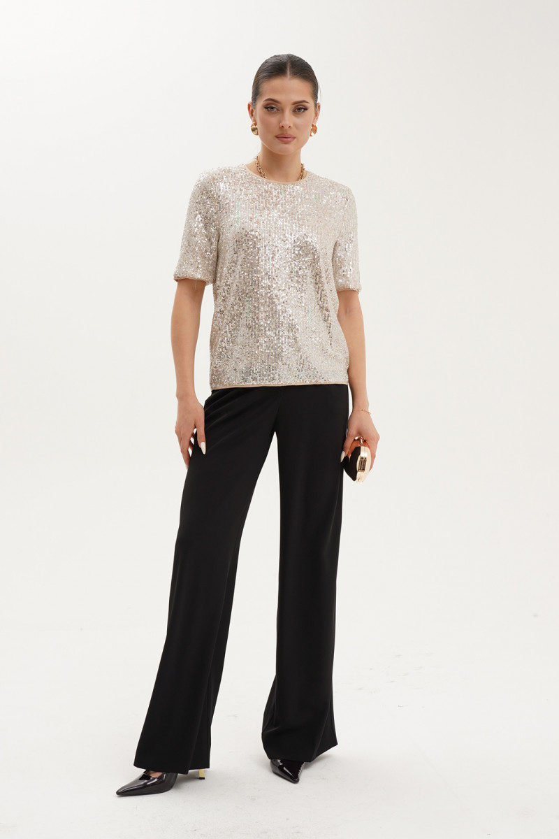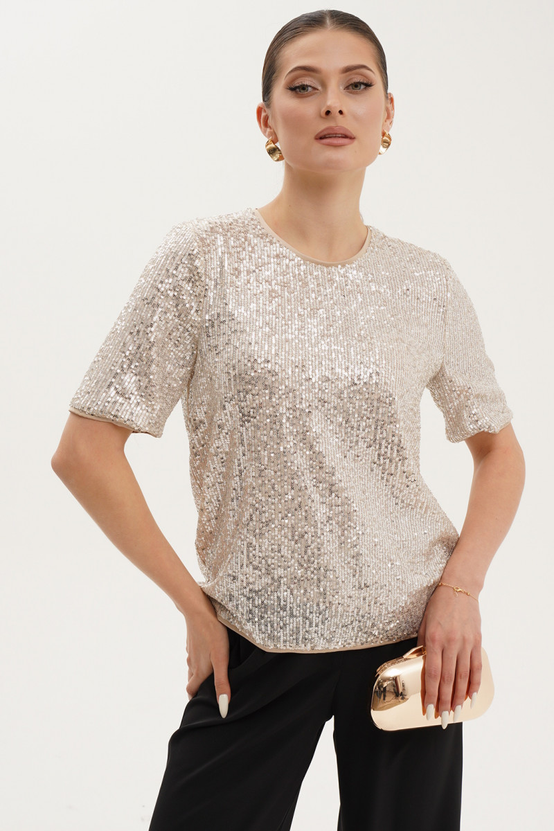 Блузка женская прямого силуэта для повседневной носки. Блузка с пайетками. Спинка с средним швом и застежкой-молнией в шве. Низ изделия обработан окантовочной сеткой. Горловина обработана окантовочной сеткой. Рукава втачные чуть ниже локтя, низ рукава обработан окантовочной сеткой. Блузка на вискозной подкладке. Очень красивая и элегантная блузка, которая будет отлично сидеть на любой фигуре.