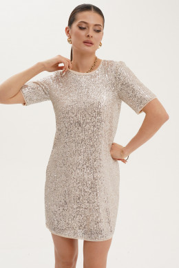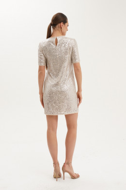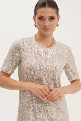 Платье женское из ткани с пайетками прямого силуэта для торжественных случаев. Горловина круглая. Рукав короткий. Низ рукава и низ платья обработан кантом из сетки. Платье полностью на подкладке. Подкладка вискозная, очень приятная к телу. Очень изысканное платье на все случаи жизни, комфортное в носке и с безупречной посадкой по телу.