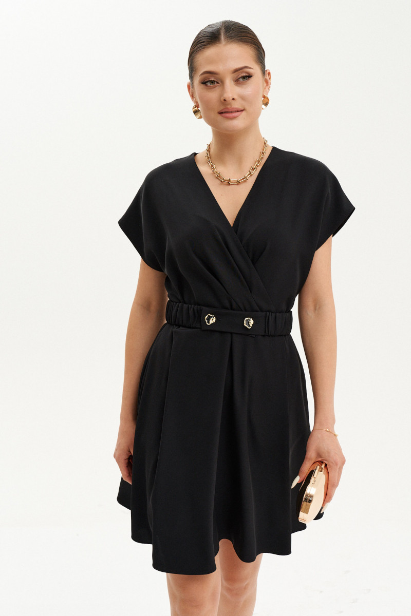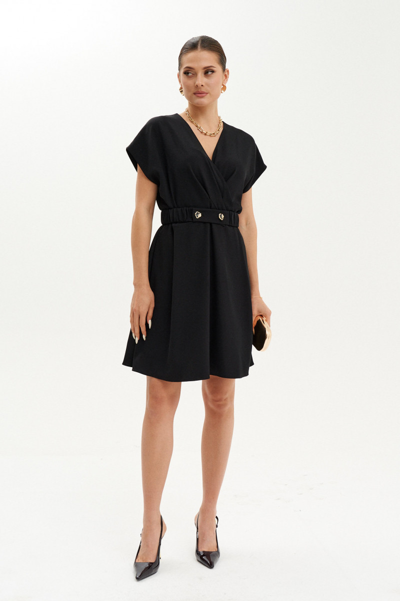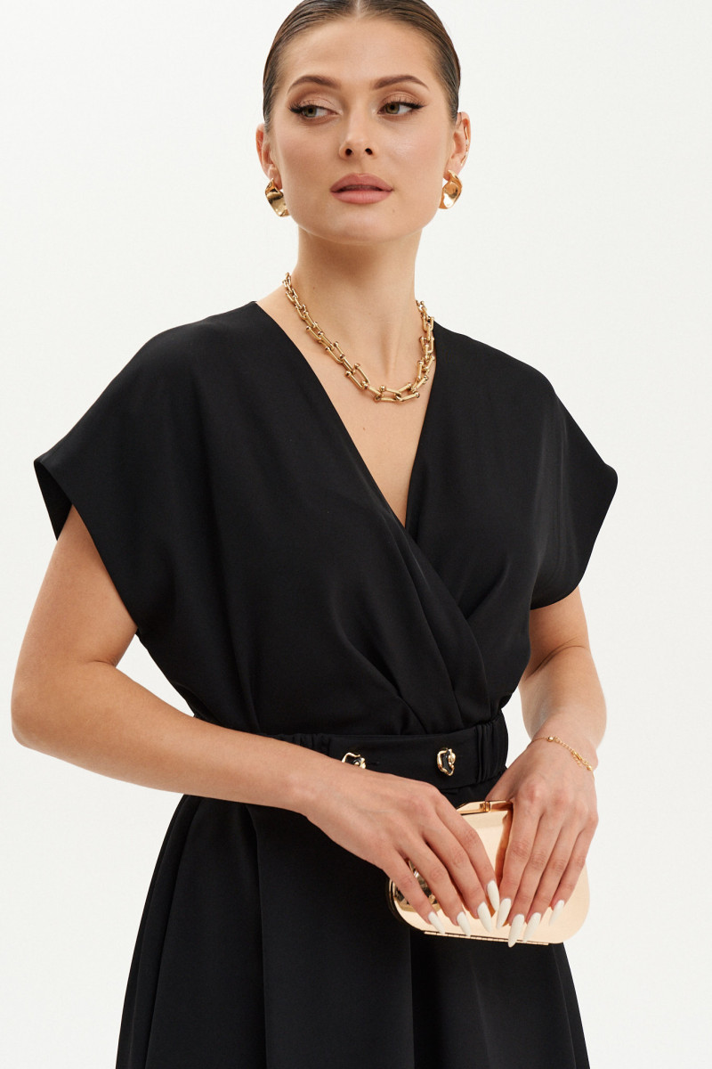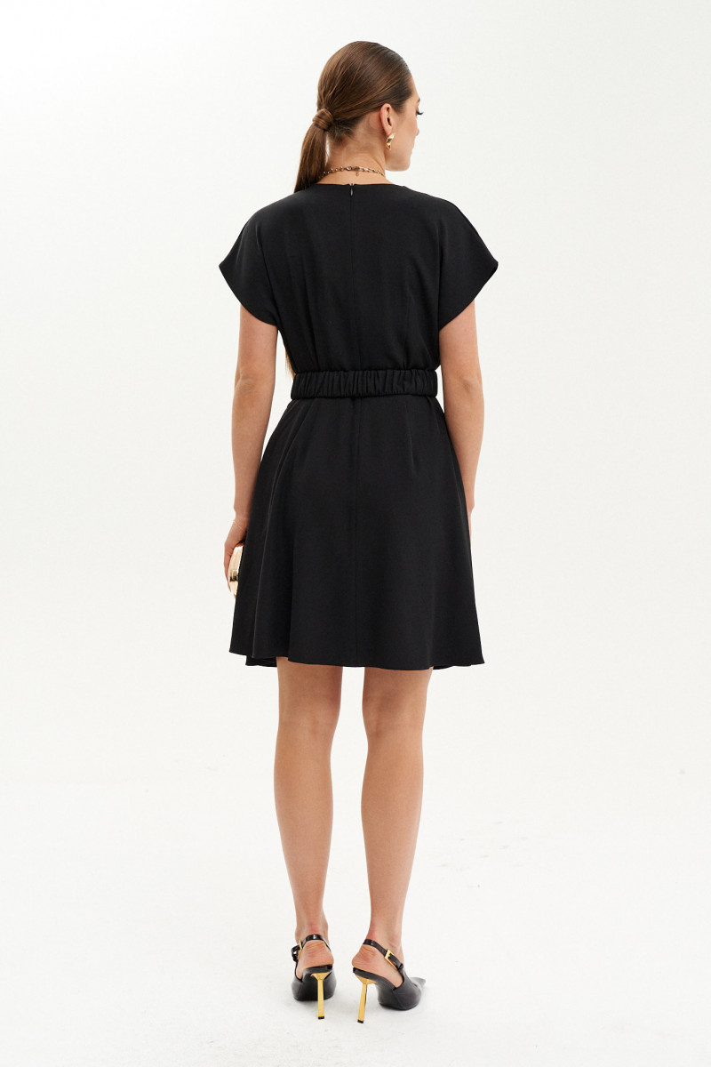 Платье женское из струящейся ткани полуприлегающего силуэта. Платье отрезное по линии талии. Верхняя часть платья на запах со складками. Платье, расширенное к низу. Переднее полотнище имеет два защипа. Спинка имеет талиевые вытачки и средний шов, имеется застежка-молния в шве. Заднее полотнище юбки имеет две талиевые вытачки. В боковом шве платья имеются прорезные карманы. Горловина V-образная. Рукава цельнокроеные, короткие. Платье на вискозной подкладке. Для придания еще большего облегания в области талии имеется пояс на резинке. Очень стильное и изящное платье, которое отлично будет подчеркивать вашу фигуру. Подойдёт для торжественных случаев. Платье очень удобное и практичное в носке.