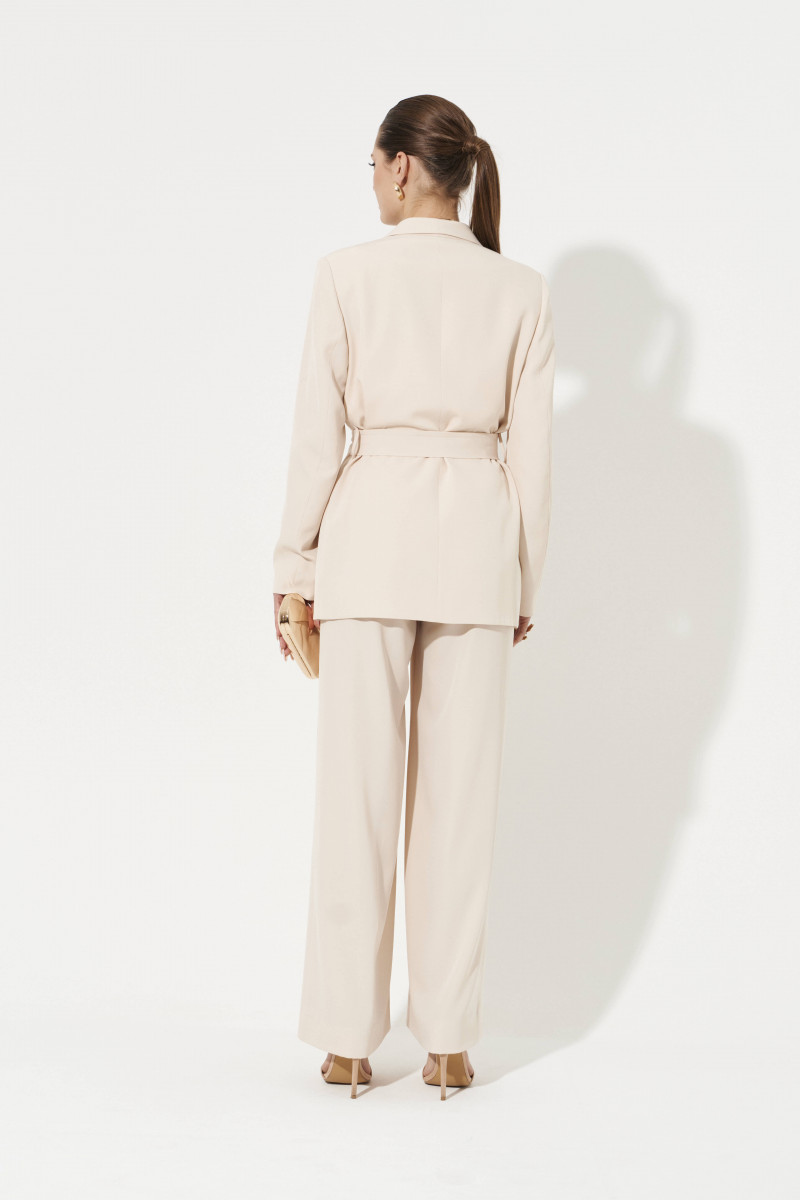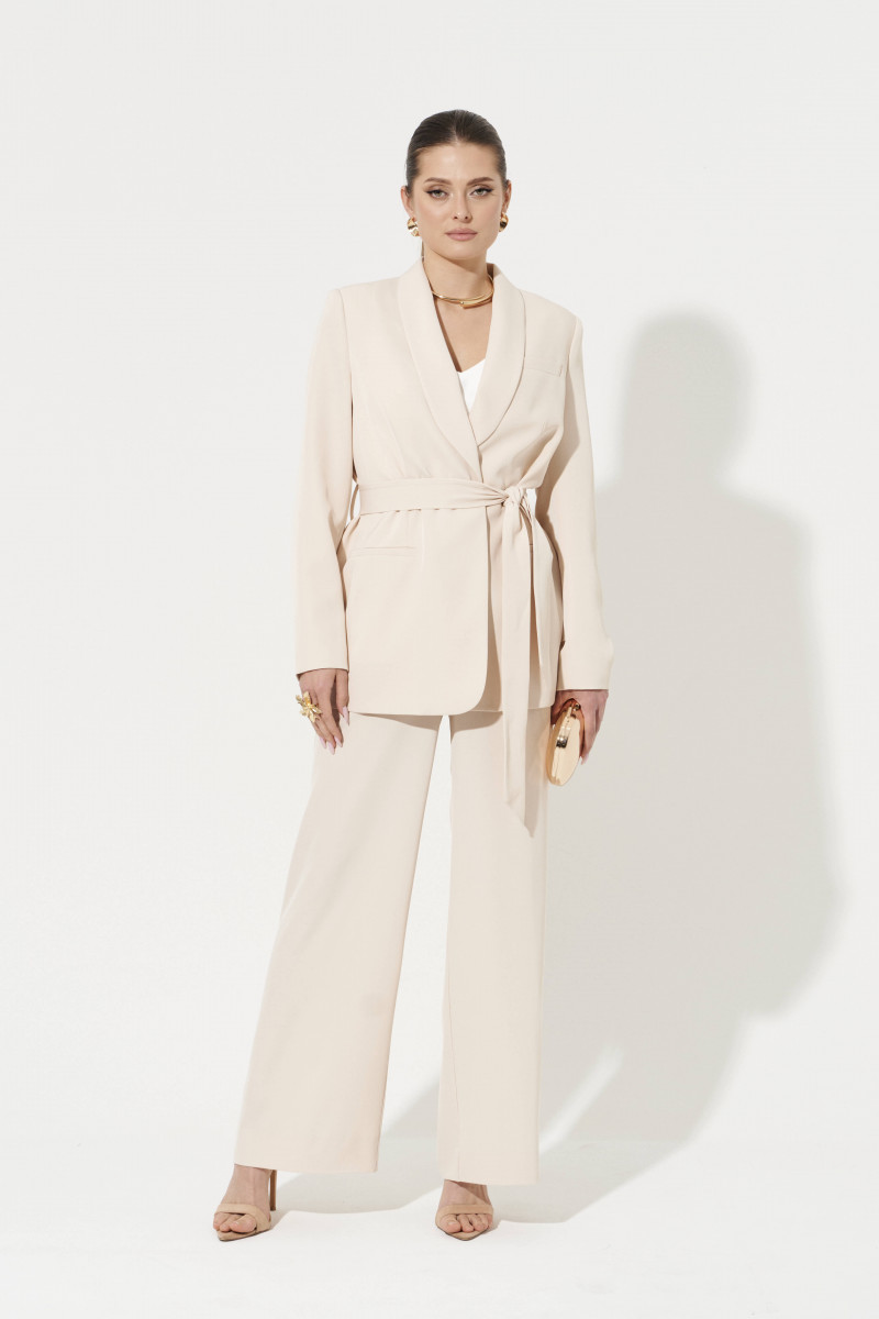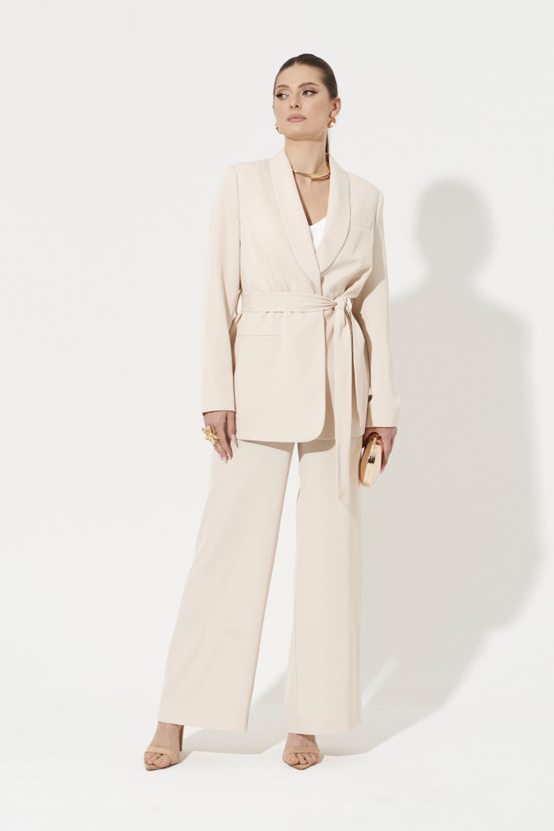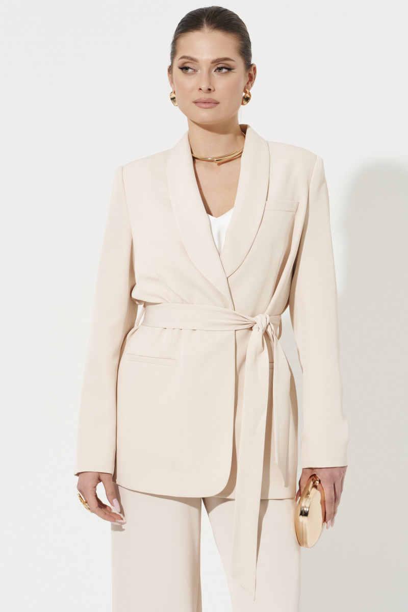 Жакет женский из лёгкой костюмной ткани прямого силуэта для повседневной и торжественной носки. Перед имеет нагрудный карман с листочкой, а также два прорезных кармана с листочкой. По переду располагаются два рельефа, идущих от линии проймы до линии низа, а также две талиевые вытачки. Спинка со средним швом. Горловина обработана воротником шаль. Рукава втачные длинные, двухшовные. Жакет на поливискозной подкладке. Для придания формы в области талии имеется пояс, а также потайная пуговица для фиксации. Пояс из основной ткани. В качестве дополнительного элемента имеется украшение в виде цветка (чокер) на завязке. Данный аксессуар регулируется длиной шнуровок лобо крепится на булавку. Позволяет варьировать использование вашего чокера с новым образами, а также можно использовать наш чокер в виде замечательной брошки. Красивый и утонченный жакет в котором любая девушка будет чувствовать себя в центре внимания.