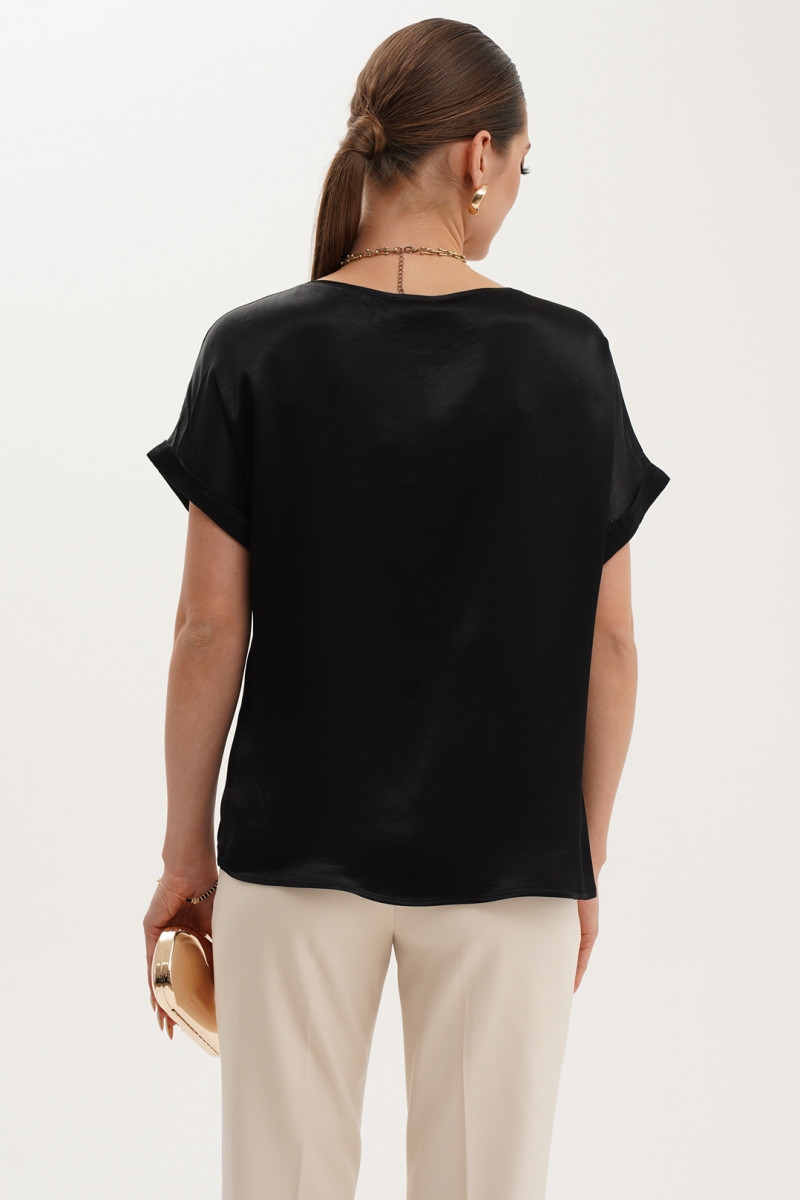 Блузка из вискозной ткани для повседневной носки. Блузка прямого силуэта. Горловина обработана притачной бейкой. Линия плеча слегка спущена. Пройма обработана притачной манжетой. По боковым швам имеются разрезы. Идеальная базовая блузка на любой выход.