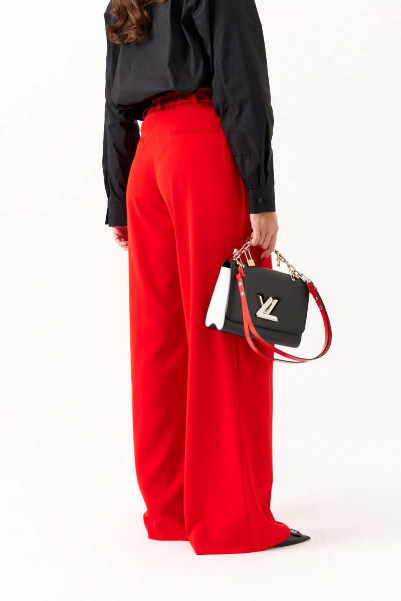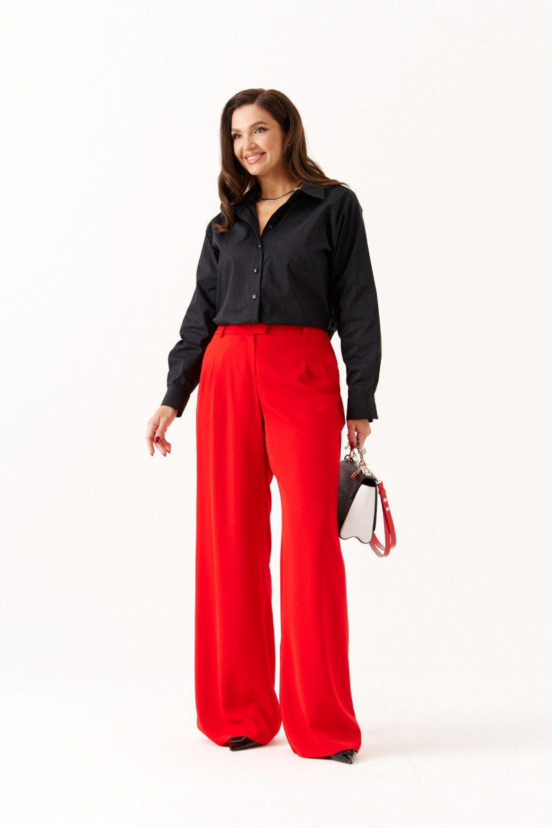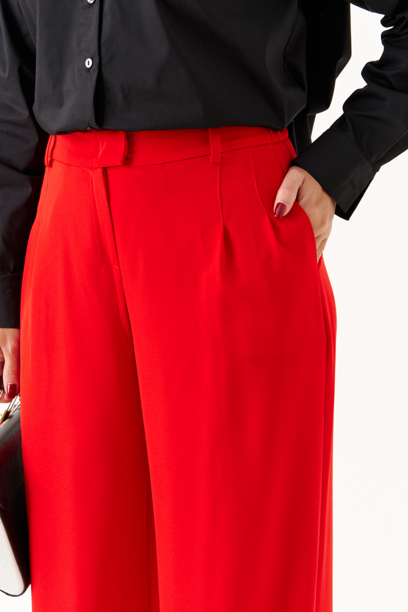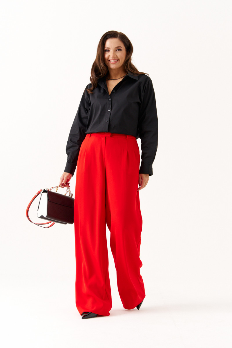 Брюки женские прямые из лёгкой струящейся ткани. Верхний срез брюк обработан притачным поясом с вставкой на резинке по задней части брюк, застежка на одну обметанную петлю и одну пуговицу, а также имеется застежка на тесьму-молнию в среднем шве брюк. Передняя часть брюк имеет четыре талиевых вытачки. Задняя часть брюк имеет две талиевые вытачки и прорезной карман в рамку. В брюках расположен в боковом шве прорезной карман. Брюки подойдут для повседневной носки либо для торжественных случаев. Отличный классический вариант брюк, которые будут гармонично смотреться под любые изделия.