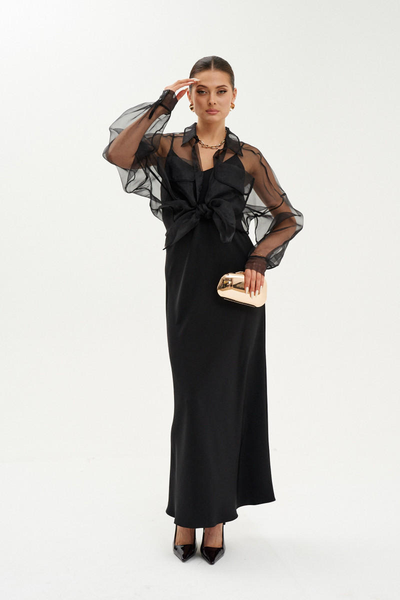 Это элегантное платье свободного кроя с плавным, струящимся силуэтом, чуть расширяющимся к низу. Модель выполнена из легкой ткани с нарядным блеском, что придает ей особую изысканность. Передняя часть украшена двумя нагрудными вытачками, создающими аккуратный и женственный силуэт. Вырезы по переду и спинке выполнены в V-образной форме и обработаны обтачками, что добавляет модели утонченности. Тонкие бретели делают образ легким и воздушным. Длина изделия — макси, что делает модель универсальной для различных случаев — как для повседневной носки, так и для торжественных мероприятий. Эта модель чёрного оттенка идеально подойдет любой фигуре благодаря своему свободному фасону и элегантному стилю.