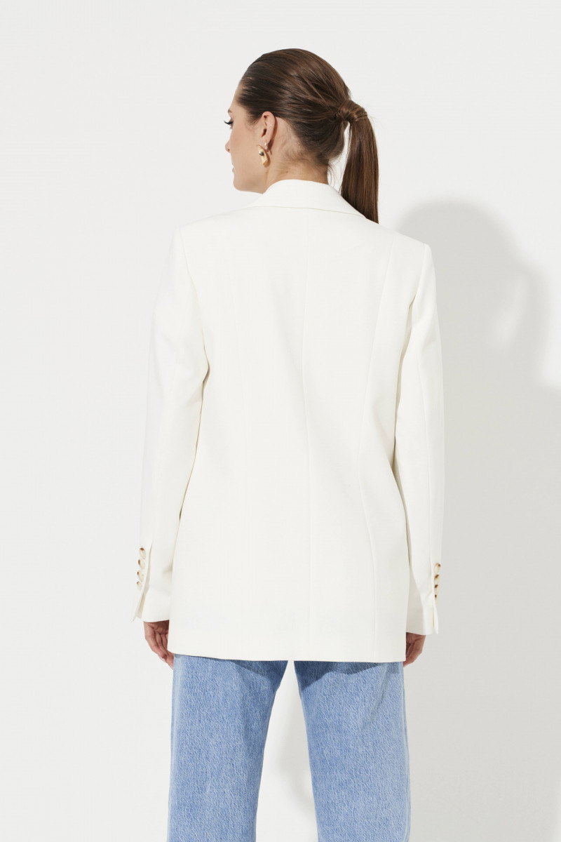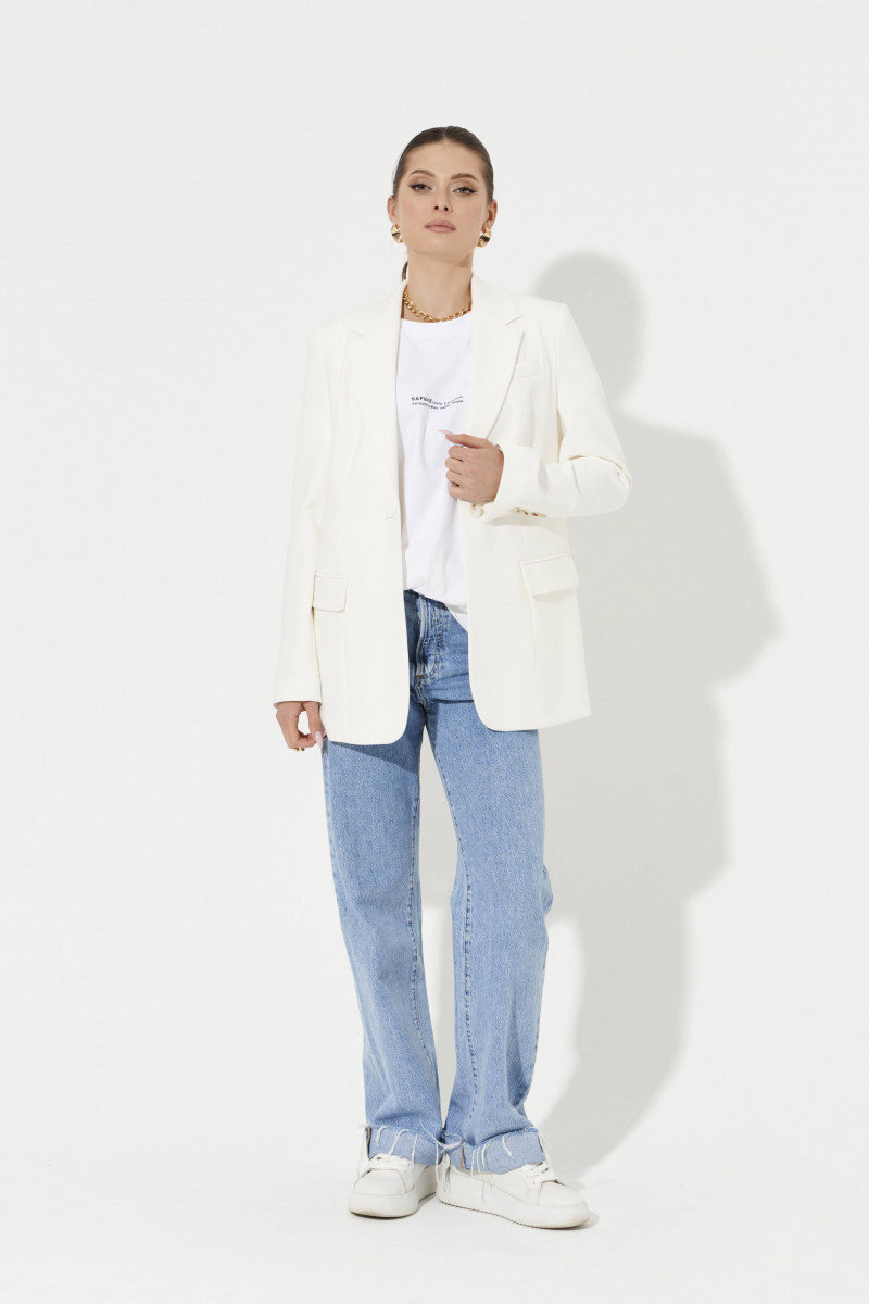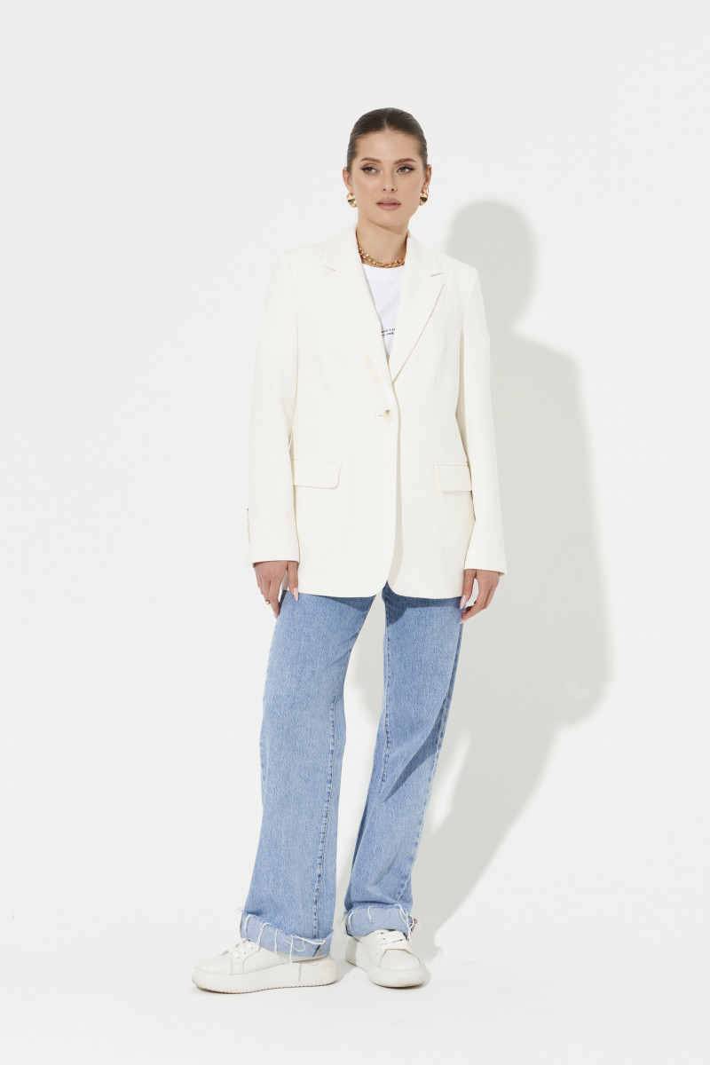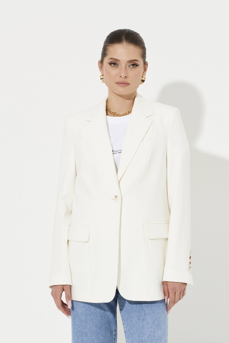Жакет женский из смесовой ткани для повседневной носки. Застежка центральная бортовая на одну обметанную петлю и одну пуговицу. Борт переда скруглён по низу. Перед имеет два вертикальных рельефа, идущих от линии плеча до низа изделия, а также имеется нагрудный карман с листочкой. На переде располагаются два кармана с клапаном и двумя обтачками. Спинка со средним швом, а также имеет два вертикальных рельефа идущих от линии плеча до низа изделия. Горловина обработана пиджачным воротником. Рукава втачные длинные, по низу рукава имеется шлица с застежкой на четыре обметанные петли и четыре пуговицы. Жакет на поливискозной подкладке. Очень стильный и красивый жакет в котором вы обязательно будете притягивать восхищенные взгляды.