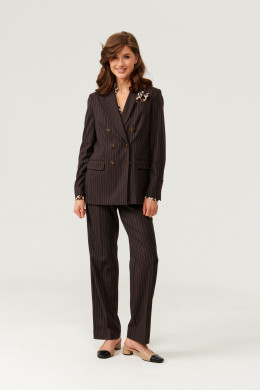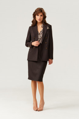 Жакет женский из поливискозной ткани с рисунком в полоску. Жакет прямого силуэта. Жакет двубортный на две обметанные петли и пуговицы. Перед имеет два прорезных кармана с клапаном и двумя обтачками, а также нагрудный карман с листочкой и декоративным шейным платком. На переде располагается две талиевые вытачки. Жакет имеет отрезной бочок. Спинка со средним швом и двумя вертикальными рельефами, идущими от линии плеча до линии низа. Горловина обработана пиджачным воротником. Рукава втачные длинные, низ рукава обработан шлицей с застежкой на обметанные петли и пуговицы. Жакет на подкладке с дизайнерским принтом. Данный жакет подойдет для любого рода мероприятий, в нем вы обязательно затмите всех своим стилем и красотой. Жакет коричневого оттенка можно сочетать с брюками из этой же коллекции.