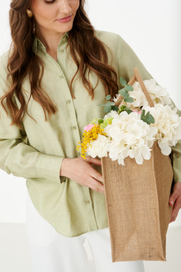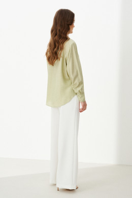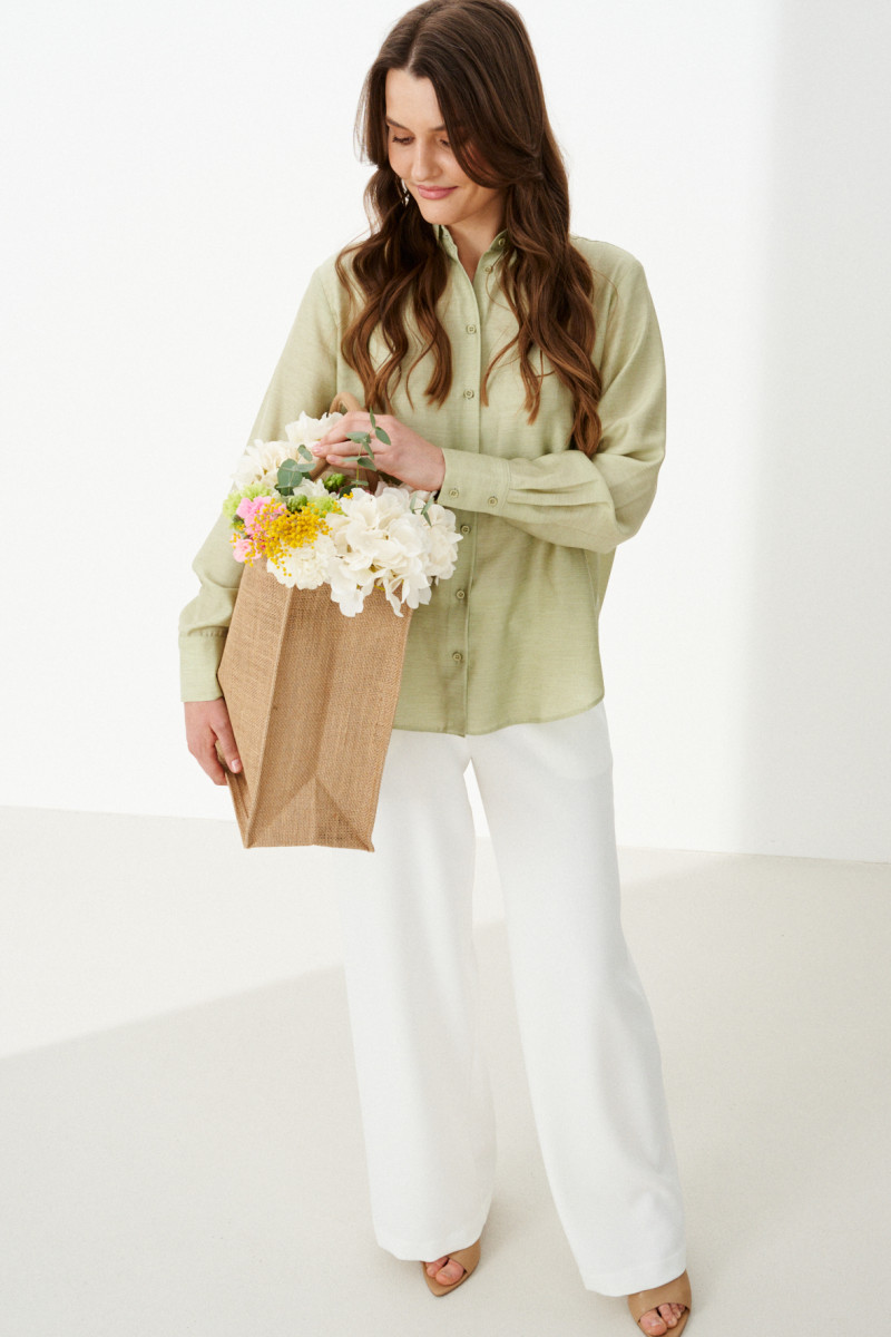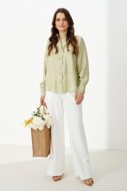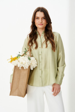 Эта стильная женская блузка нежного оливкового оттенка идеально подойдет для повседневной носки. Выполненная в прямом силуэте, она обеспечивает комфорт и свободу движений. Ткань поливискозная, струящаяся, что придает изделию легкость и изящность. Перед украшен центральной бортовой застежкой на обметанные петли и пуговицы, а низ изделия выполнен с закругленным краем, добавляя изящества образу. Горловина оформлена классическим рубашечным воротником, а рукава завершены притачными манжетами с застежками на две обметанные петли и пуговицы — практично и стильно. Эта очень легкая и практичная блузка станет отличным выбором для ежедневных образов, сочетая комфорт с элегантностью и привлекательностью.