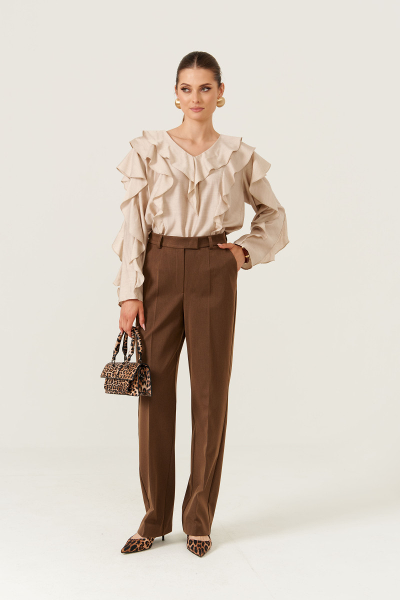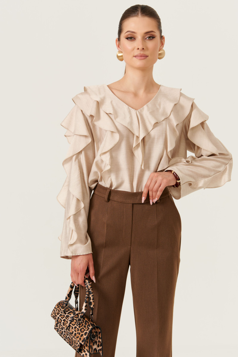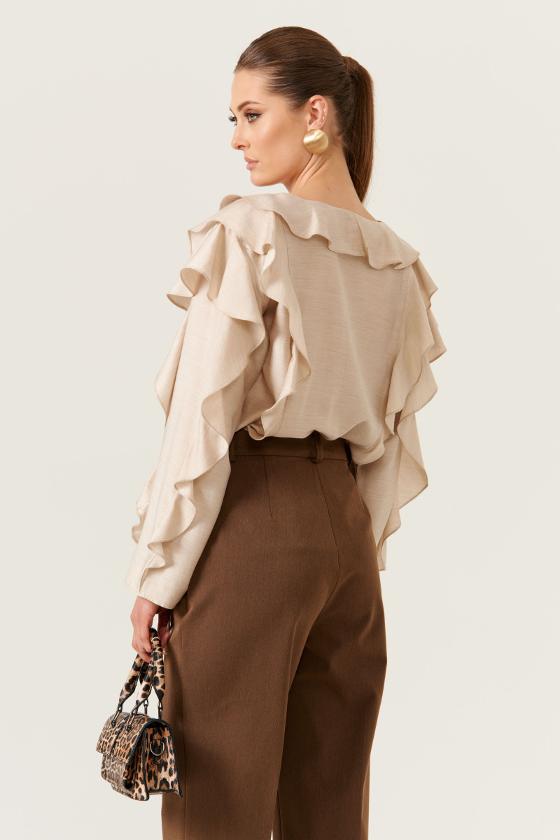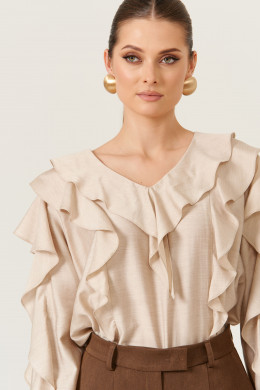Эта женская блузка выполнена из легкой и воздушной поливискозной ткани с добавлением шерсти, что придает ей приятную мягкость и комфорт в носке. Ее бежевый оттенок делает образ нежным и универсальным, подходящим для повседневных ситуаций.