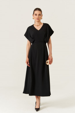 Платье женское из струящейся ткани для повседневной и торжественной носки. Платье полуприлегающего силуэта. платье отрезное по линии талии. Лиф переда имеет средний шов и складки. Лиф спинки имеет складки и средний шов с потайной застежкой молнией. Горловина V-образная. Рукава цельнокроеные, короткие. Юбка платья, расширенная к низу. Переднее полотнище юбки имеет складки. Заднее полотнище юбки со средним швом и вытачками. Платье длиной макси. Платье на вискозной подкладке. Данная модель платья в классическом чёрном цвете покорит вас своей красотой и великолепной посадкой. В данном платье вы будете выглядеть неотразимо и будете ловить на себе восхищенные взгляды.