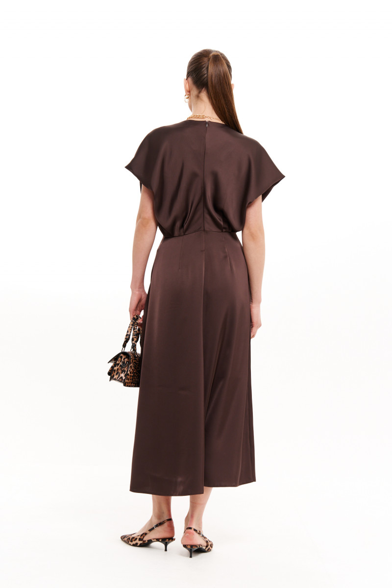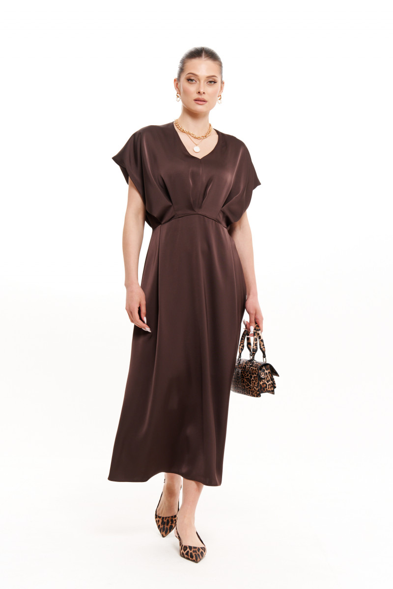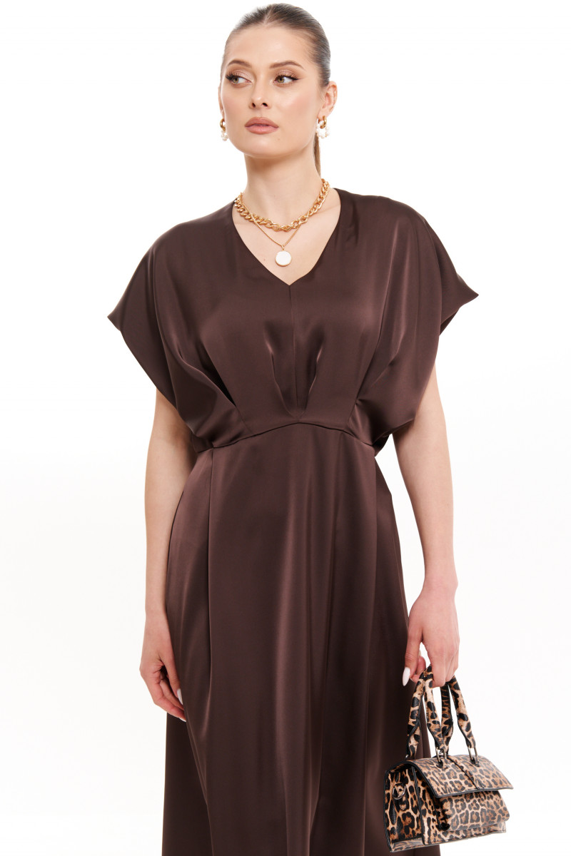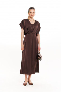 Платье женское из струящейся ткани для повседневной и торжественной носки. Платье полуприлегающего силуэта. платье отрезное по линии талии. Лиф переда имеет средний шов и складки. Лиф спинки имеет складки и средний шов с потайной застежкой молнией. Горловина V-образная. Рукава цельнокроеные, короткие. Юбка платья, расширенная к низу. Переднее полотнище юбки имеет складки. Заднее полотнище юбки со средним швом и вытачками. Платье длиной макси. Платье на вискозной подкладке. Данная модель платья в элегантном коричневом цвете покорит вас своей красотой и великолепной посадкой. В данном платье вы будете выглядеть неотразимо и будете ловить на себе восхищенные взгляды.