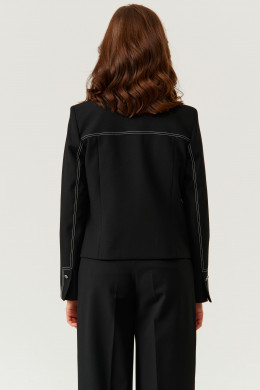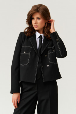 Жакет женский из поливискозной ткани. Жакет прямого силуэта для повседневной носки. Жакет двубортный на потайные кнопки. Перед имеет отрезную кокетку с двумя накладными карманами и застежкой на одну обметанную петлю и одну пуговицу. Спинка с отрезной кокеткой и двумя рельефами, идущими от линии кокетки до линии низа. Горловина обработана пиджачным воротником. Рукава втачные длинные, по низу рукава имеется декоративная шлица с пуговицей. Жакет имеет отделочные строчки белого цвета по кокетке, по воротнику, краю лацкана, раскепу, накладным карманам и по локтевому шву рукава со шлицей. Жакет на поливискозной подкладке. Стильный жакет черного оттенка будет создавать впечатление утонченности и элегантности, а за счет качественного материала жакет будет очень комфортным к телу. В данном жакете вы будете смотреться очень очаровательно ведь он отлично подчеркнет все ваши достоинства и сделает вас в центре всеобщего восхищения.