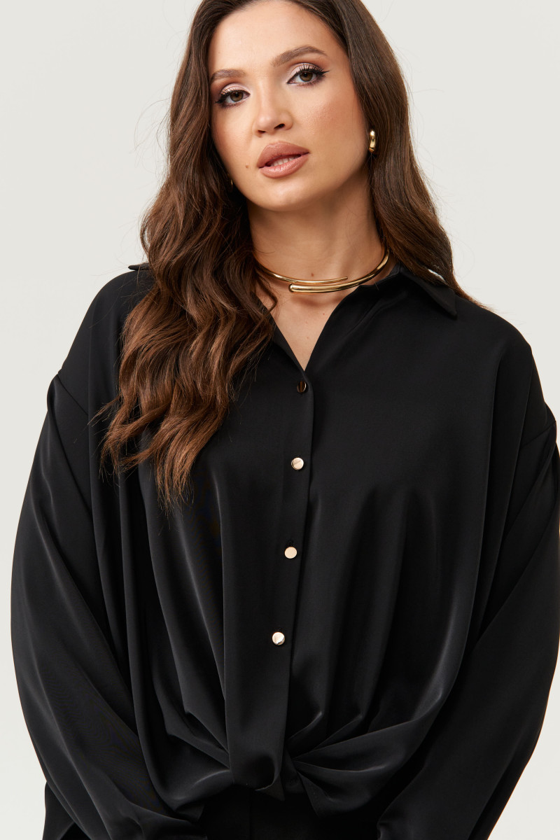 Блузка женская из струящейся ткани для повседневной носки либо для торжественных случаев. Блузка прямого силуэта. Застежка в блузке центральная бортовая на обметанные петли и пуговицы. Перед имеет декоративный узел. Спинка с отрезной кокеткой и бантовой складкой. Спинка изделия длиннее чем перед и имеет полукруглый низ. Горловина обработана воротником с отрезной стойкой. Рукава втачные длинные, низ рукава обработан притачной манжетой с застежкой на одну обметанную петлю и одну пуговицу. Очень легкая и практичная блузка, с оригинальным перекрутом. Блузка классического чёрного цвета безусловно украсит любой ваш образ и отлично подчеркнет все достоинства вашей фигуры.