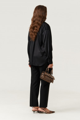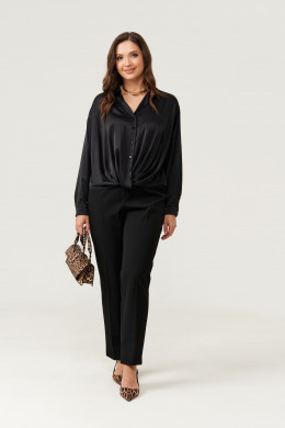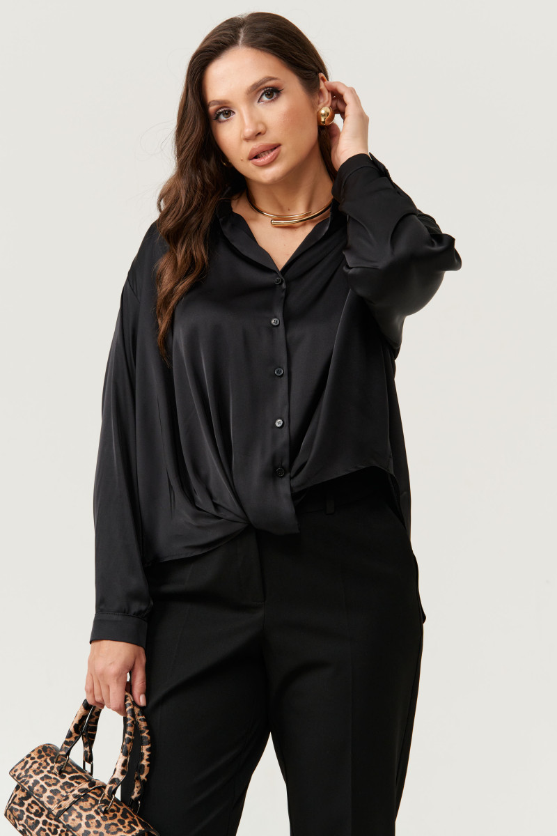 Блузка женская из струящейся ткани для повседневной носки. Блузка прямого силуэта. Застежка в блузке центральная бортовая на обметанные петли и пуговицы. Перед имеет декоративный узел. Спинка с отрезной кокеткой и бантовой складкой. Спинка изделия длиннее чем перед и имеет полукруглый низ. Горловина обработана воротником с отрезной стойкой. Рукава втачные длинные, низ рукава обработан притачной манжетой с застежкой на одну обмётанную петлю и одну пуговицу. Очень легкая и практичная блузка, с оригинальным перекрутом. Блузка в классическом чёрном цвете безусловно украсит любой ваш образ и отлично подчеркнет все достоинства вашей фигуры.