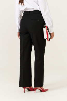 Женские брюки из поливискозной ткани чёрного цвета предназначены для повседневной носки. Верхний срез брюк обработан притачным поясом с застежкой на крючок и молнию в среднем шве. По поясу расположены шлевки для ремня. Передняя часть украшена двумя талиевыми вытачками, обеспечивающими хорошую посадку. Задняя часть также имеет две талиевые вытачки и два кармана с листочкой для удобства. В боковом шве расположены карманы с подкройным бочком, что добавляет функциональности и аккуратности внешнему виду. Брюки выполнены из мягкой и приятной на ощупь ткани, легко сочетаются с различными топами и обувью, создавая стильный повседневный образ.