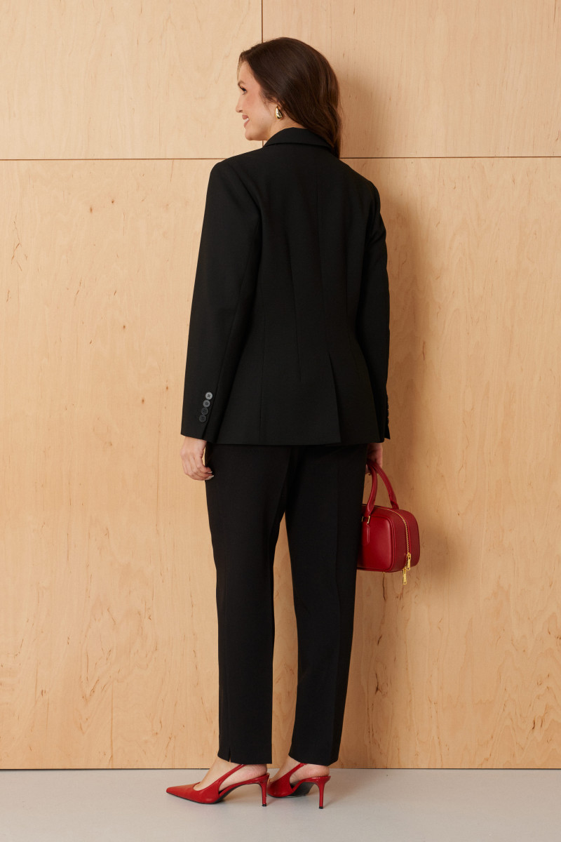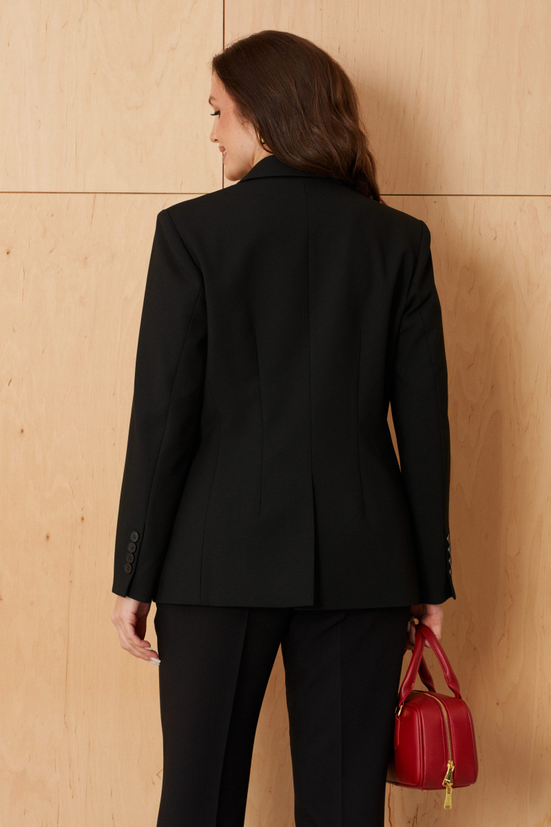Спинка оформлена средним швом с шлицей, а также имеет две талиевые вытачки для более хорошей посадки. Горловина обработана пиджачным воротником, придающим образу классическую строгость. Длинные втачные рукава украшены декоративной шлицей с пуговицами у низа, что добавляет модели изящества и деталей.