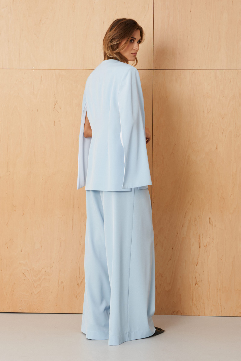 Этот женский жакет выполнен из струящейся ткани, что делает его идеальным для повседневной носки. Модель обладает прямым силуэтом, который обеспечивает комфорт и универсальность. Застежка на одну кнопку придает жакету аккуратный и элегантный вид, а перед украшен двумя нагрудными вытачками, подчеркивающими линию груди и создающими приятную посадку. Спинка с центровым швом и двумя талиевыми вытачками обеспечивает отличную посадку по фигуре. Боковой шов укреплен притачной небольшой частью, что добавляет прочности и аккуратности конструкции. V-образная горловина придает образу изящность, а длинные втачные рукава с свободным разрезом создают комфорт и стильный акцент. Жакет на подкладке, что обеспечивает дополнительный комфорт при ношении и аккуратный внешний вид. Выполненный в голубом цвете, этот жакет отлично дополняет повседневные образы и легко сочетается с различными элементами гардероба.