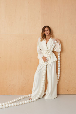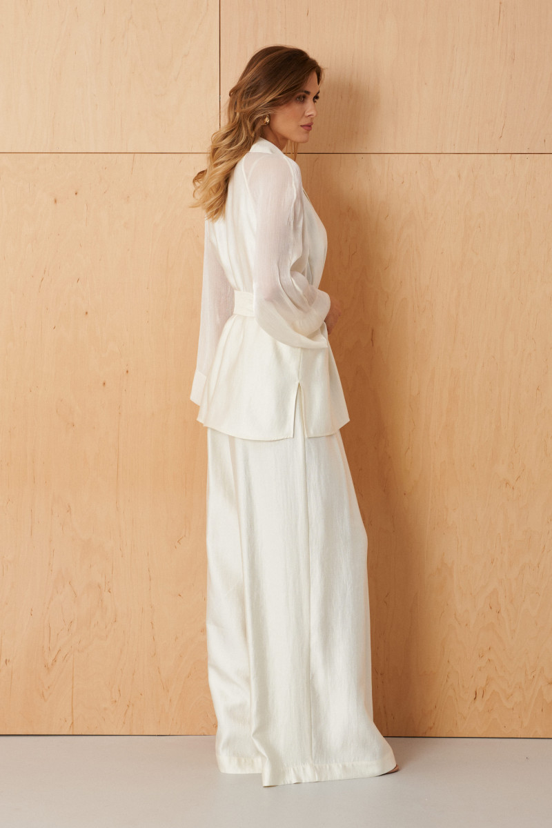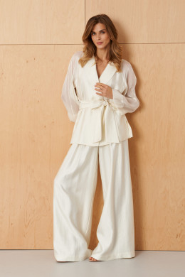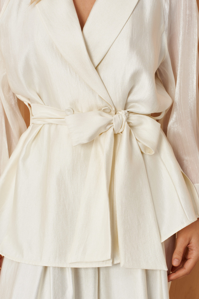 Этот женский жакет выполнен из струящейся мягкой ткани, идеально подходящей для торжественных случаев. Модель выполнена в молочном оттенке и обладает элегантным и аккуратным фасоном. Центральная бортовая застежка с обметанными петлями и пуговицами придает жакету строгий и изящный внешний вид. Передняя часть украшена двумя рельефами, которые начинаются от пройм и тянутся до линии низа, создавая интересные линий и объемность силуэта. В боковых швах расположены небольшие разрезы, обеспечивающие свободу движений и повышая комфорт при ношении. В этих же швах вставлены шлевки, предназначенные для закрепления пояса или использования в декоративных целях. Воротник-шаль мягко обрамляет горловину, придавая образу нежность и изящность. Рукава выполнены по модели реглан из прозрачной ткани, что добавляет легкости, романтичности и воздушности образу. Жакет комплектуется поясом из основной ткани, который подчеркивает талию и создаёт женственный силуэт. Этот наряд идеально подойдет для особых мероприятий, подчеркивая элегантность и изысканность обладательницы.
