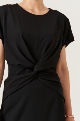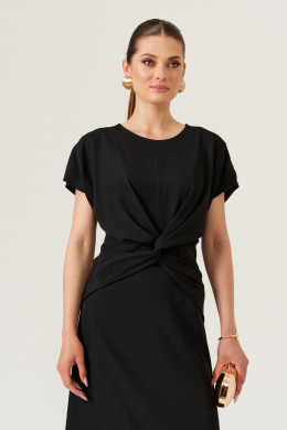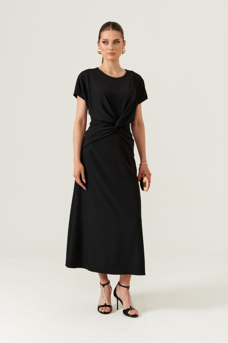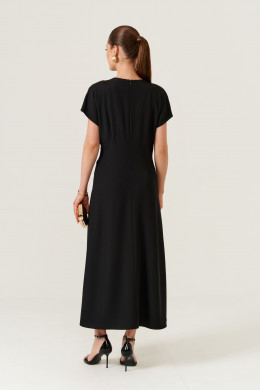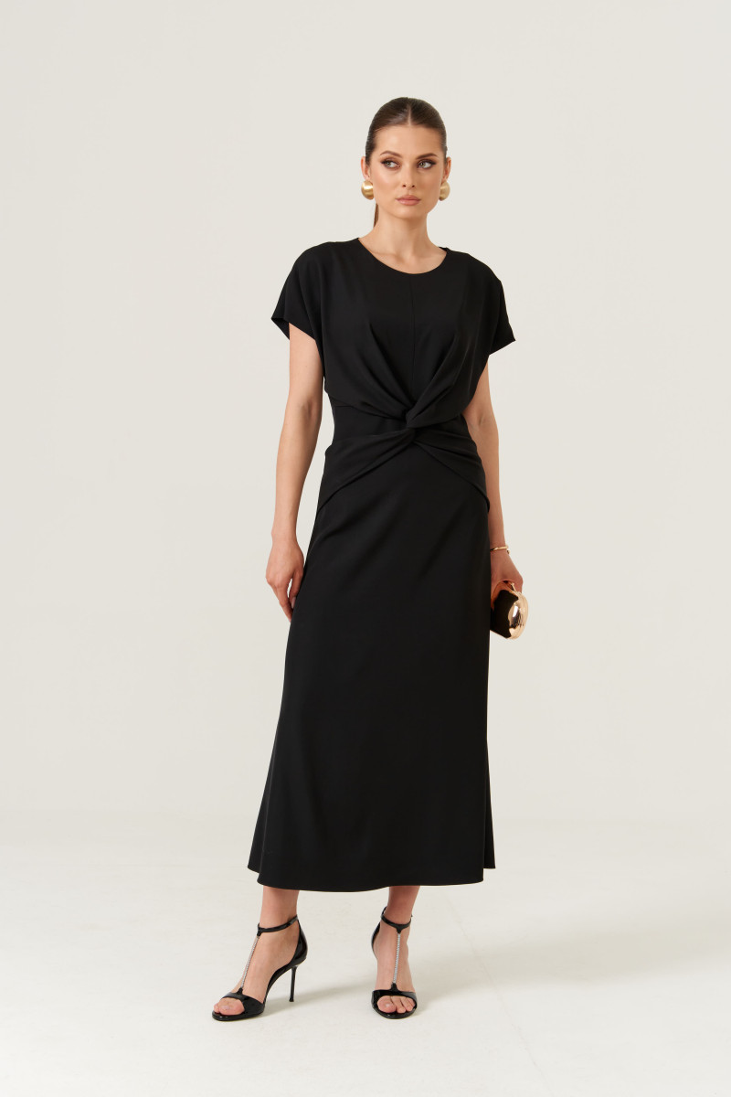 Это женское платье из поливискозной ткани, подходящее как для повседневной носки, так и для торжественных мероприятий. Модель отрезная по линии талии и выполнена в полуприлегающем силуэте, что обеспечивает комфортную посадку и элегантный силуэт. Лиф переда украшен средним швом и декоративным узлом в виде перекрута, добавляющим изящности. Спинка оснащена двумя талиевыми вытачками и средним швом, в среднем шве расположена потайная застёжка-молния для удобства надевания. Горловина круглая, рукава цельнокроеные, что создает гладкий и аккуратный вид. Платье выполнено на вискозной подкладке, что обеспечивает комфорт и хорошую посадку. Длина изделия — макси, платье чёрного цвета — это классический выбор для различных случаев.