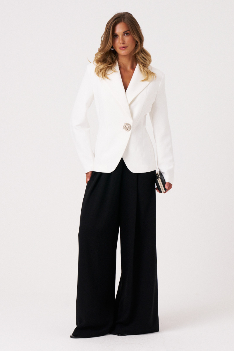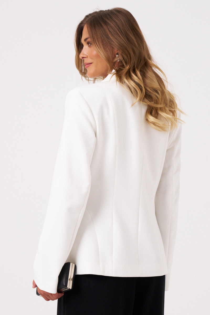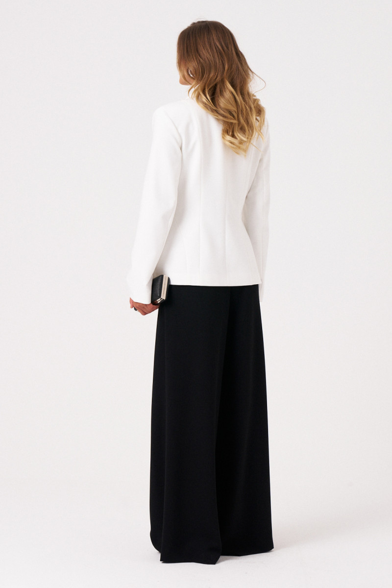 Женский жакет из поливискозной ткани, идеально подходящий для повседневной и деловой носки. Центральная застежка выполнена на одну обметанную петлю и одну металлическую декоративную пуговицу, что придает модели элегантный вид. Край борта оформлен фигурной линией, добавляющей изящества. Передняя часть украшена двумя рельефами, не доходящими до низа, и одним выходящим из бокового шва рельефом, создающим интересные объемы и линию силуэта. Спинка выполнена со средним швом и тремя рельефами, что обеспечивает хорошую посадку и стильный дизайн. Горловина обработана пиджачным воротником, а длинные втачные рукава дополняют образ. Жакет на подкладке, что обеспечивает комфорт и аккуратность посадки. Модель выполнена в классическом молочном цвете, что делает ее универсальной для различных образов и ситуаций.