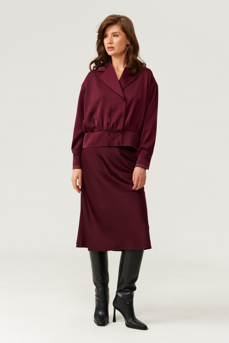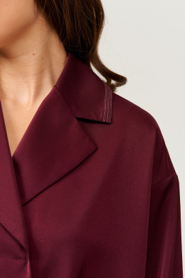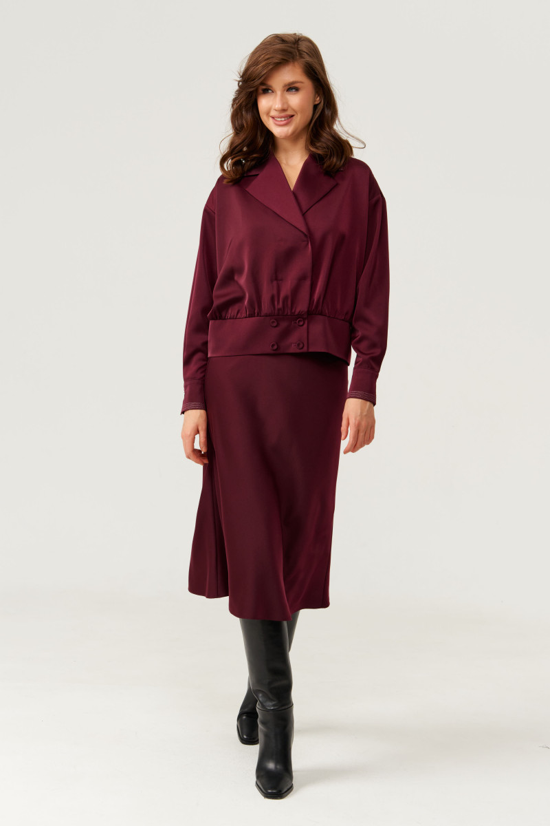 Это женский жакет из легкой, струящейся ткани, идеально подходящий для повседневных образов. Модель выполнена в классическом стиле с двубортной застежкой на кнопки, а также на обметанные петли и пуговицы, что обеспечивает надежность и удобство. Передняя часть украшена декоративными закрепками, добавляющими изящности и структурности. Спинка оформлена с отрезной кокеткой и двумя защипами, создающими аккуратную посадку и легкий объем. Низ изделия подчеркнут притачным поясом. Воротник — пиджачный, а линия плеча спущенная — придает силуэту мягкость и современность. Длинные втачные рукава завершены притачными манжетами с застежками на одну обметанную петлю и пуговицу, что позволяет регулировать объем рукава. По краю воротника и манжетам расположены декоративные блестящие полоски, добавляющие образу нотки элегантности и стильности. Этот жакет бордового оттенка станет универсальным элементом гардероба для создания как деловых, так и повседневных образов.