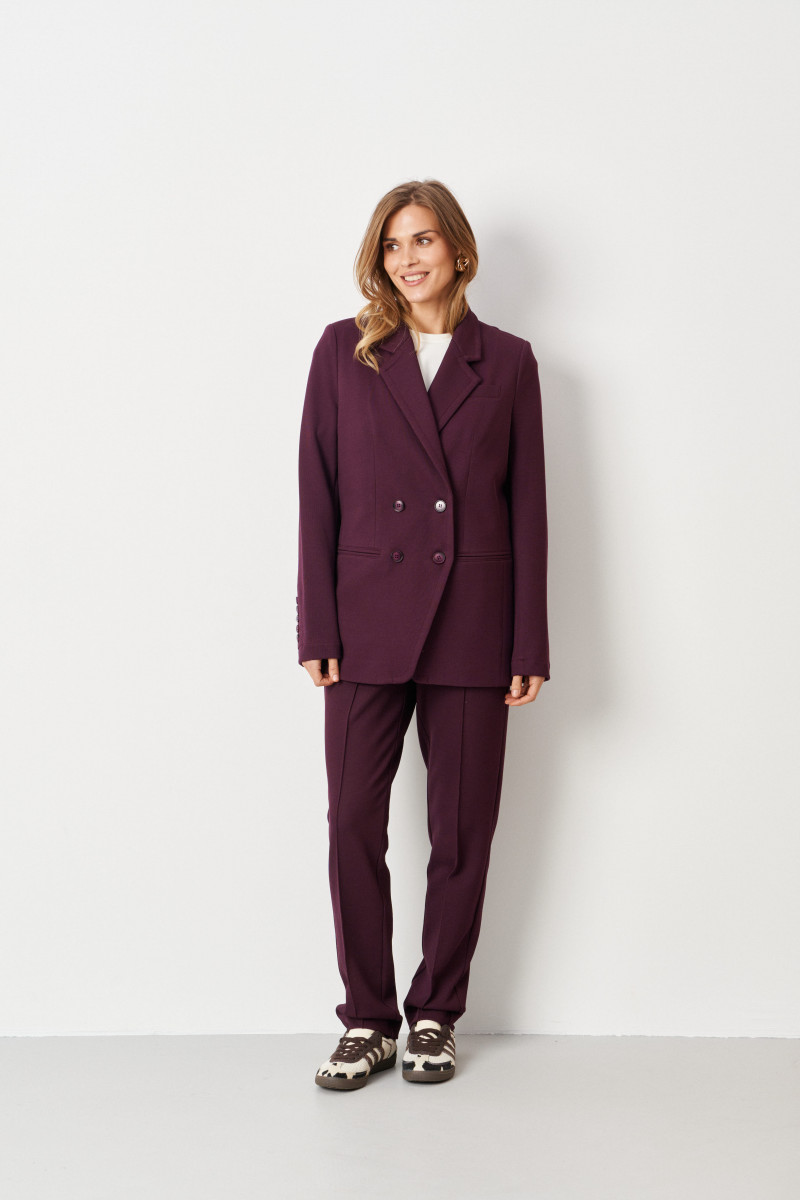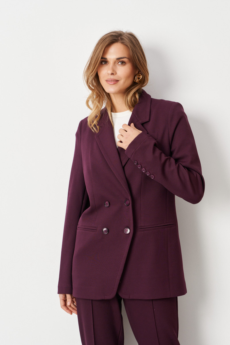 Жакет женский из трикотажа бордового цвета. Стильный жакет полуприлегающего силуэта из мягкого трикотажного полотна — идеальный выбор для повседневной носки и деловых встреч. Модель двубортная с застежкой на две обметанные петли и две пуговицы, оформленная криволинейной линией борта, которая придает образу элегантность и современность.