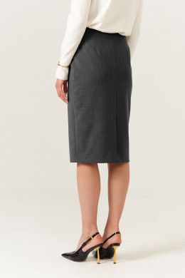 Женская юбка из смесовой ткани для повседневной носки. Полуприлегающий силуэт обеспечивает комфорт и стильный внешний вид. Верхний срез юбки обработан обтачкой, что придает изделию аккуратный и завершенный вид. Заднее полотнище имеет четыре талиевые вытачки для лучшей посадки и формы, а также располагается средний шов с потайной застежкой-молнией обеспечивает удобство при надевании и снятии юбки. На заднем полотнище в среднем шве расположен разрез-шлица, добавляющий свободу движений и стильный акцент. Юбка выполнена на подкладке, что обеспечивает комфорт при носке. Цвет — серый, универсальный и легко сочетаемый с различными топами и обувью.