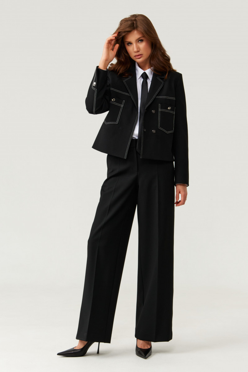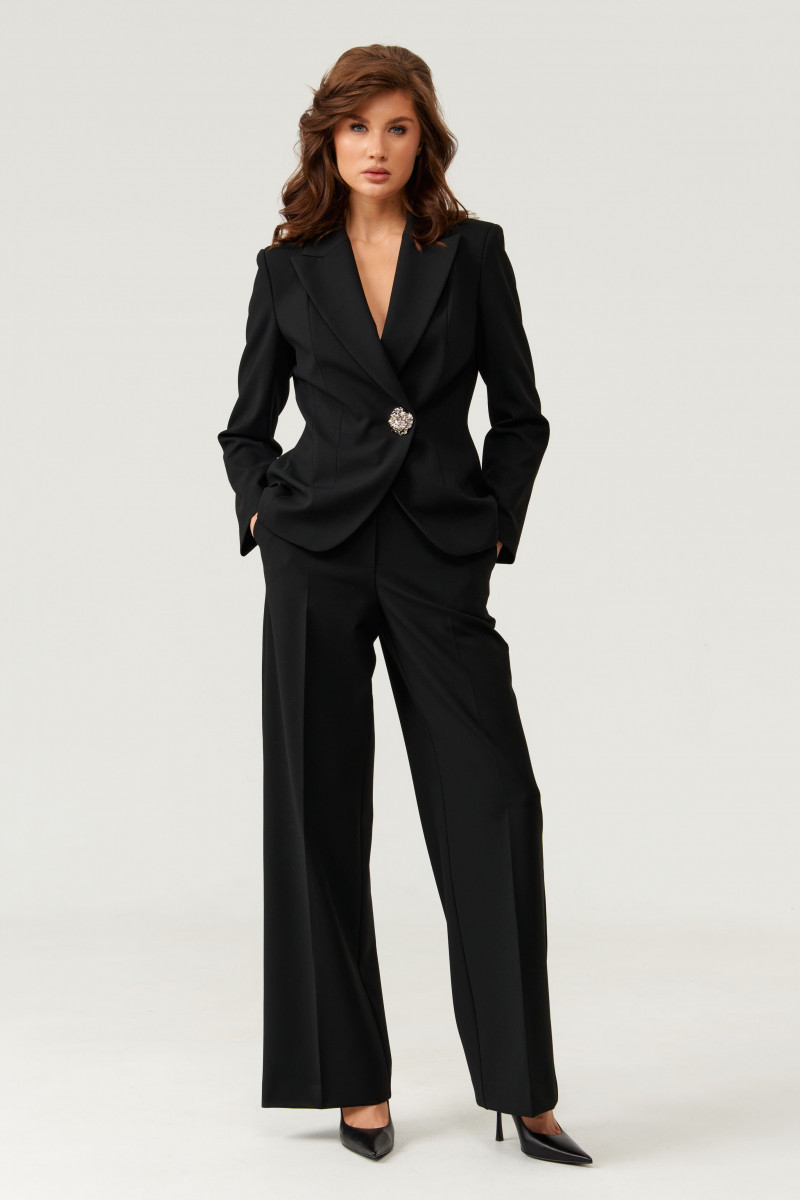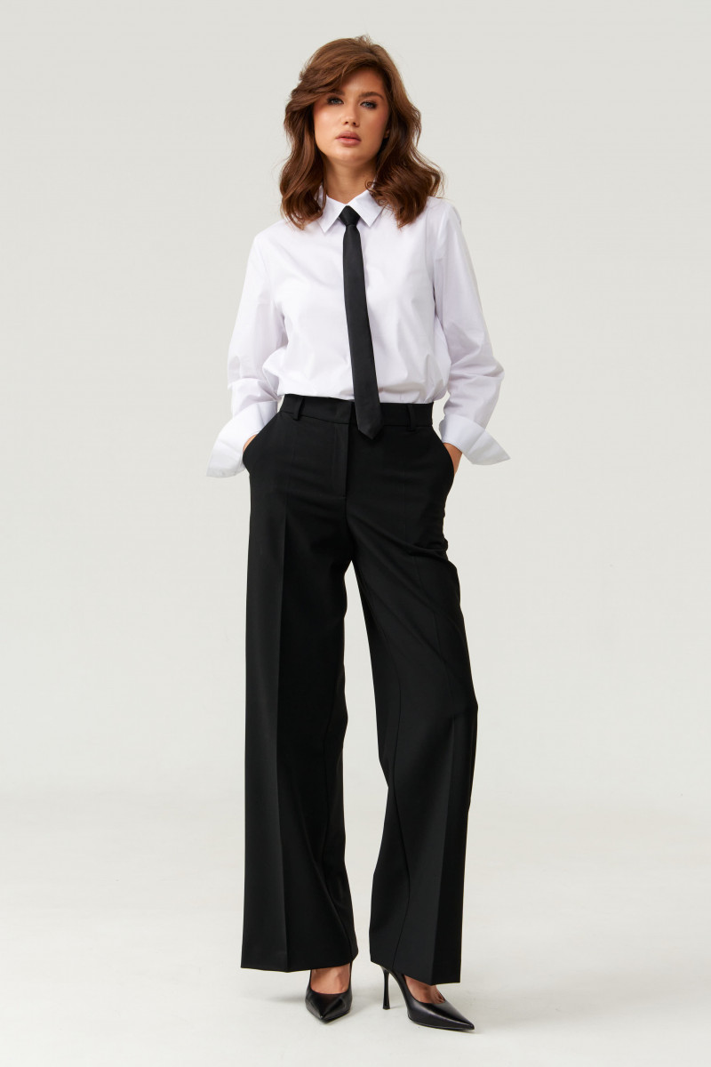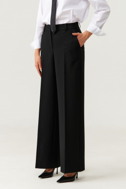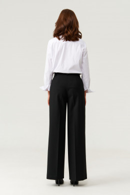 Эти женские брюки из поливискозной ткани идеально подходят для повседневной носки. Верхний срез брюк обработан притачным поясом, внутренний срез пояса украшен декоративной тесьмой, что придает изделию аккуратный и стильный вид. Застежка на крючок, а также имеется застежка на тесьму-молнию в среднем шве брюк. Пояс дополнен шлевками, позволяющими носить их с ремнём для дополнительной регулировки посадки и комфорта. Задняя часть брюк оснащена четырьмя талиевыми вытачками, обеспечивающими хорошую посадку по фигуре. В боковых швах расположены боковые прорезные карманы с подкройным бочком. Тёмно-серый оттенок делает их универсальным элементом гардероба, сочетающим стиль и практичность.