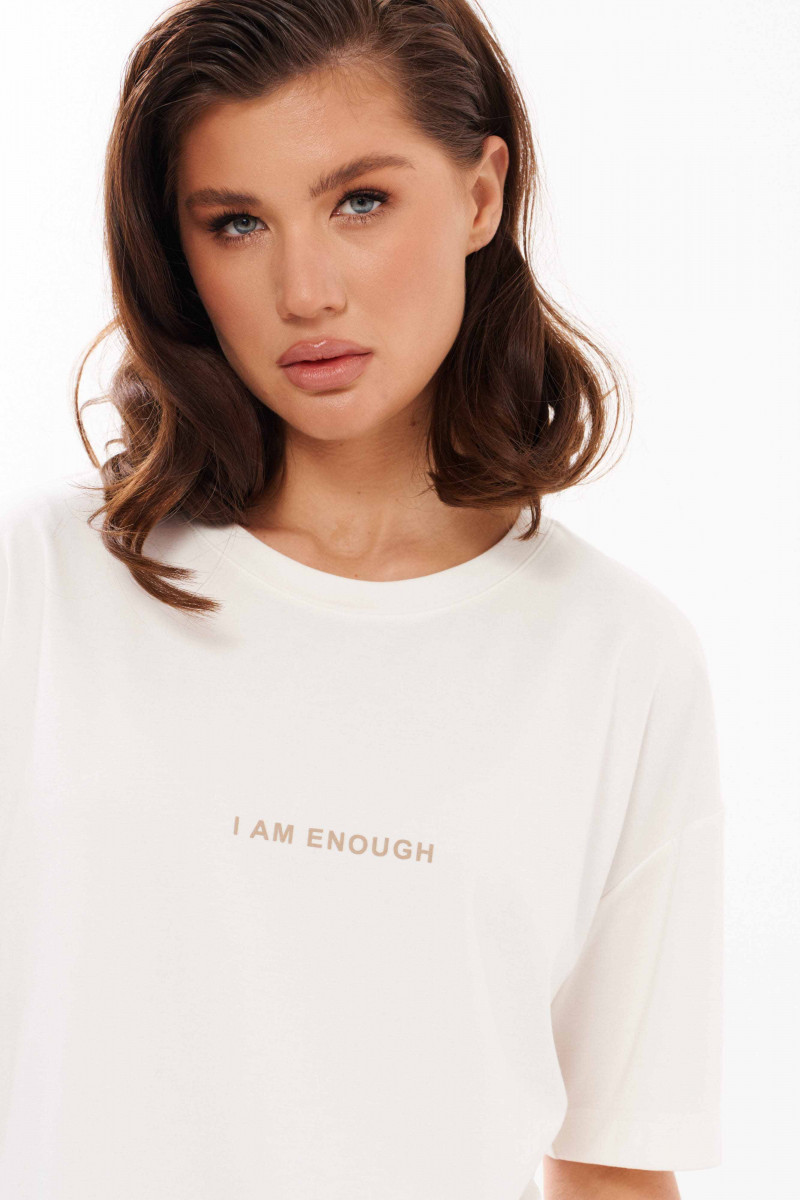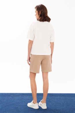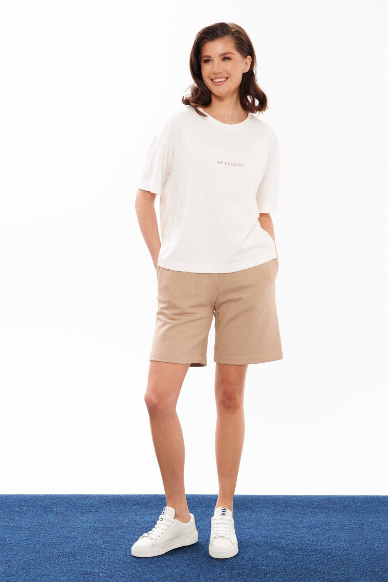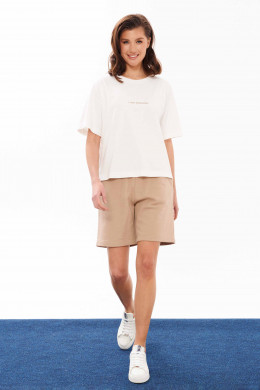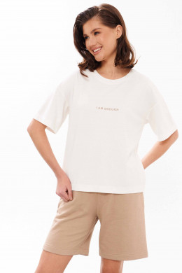 Комплект женский из смесового трикотажного полотна для повседневной носки. Комплект состоит из джемпера и шорт. Джемпер имеет по переду дизайнерскую печать в виде надписи. Горловина круглая, обработана бейкой. Линия плеча чуть спущена. Рукава втачные длиной чуть ниже локтя. Шорты прямые. Верхний срез шорт обработан цельнокроеным поясом на резинке. В боковых швах имеются потайные карманы. Шорты длиной выше колена. Отличный комплект, в котором вы обязательно будете чувствовать себя комфортна, а преимуществом является то, что вы можете комплектовать эти изделия под любой ваш образ.