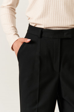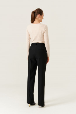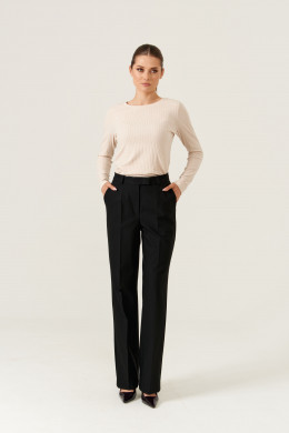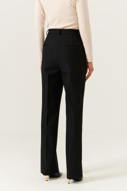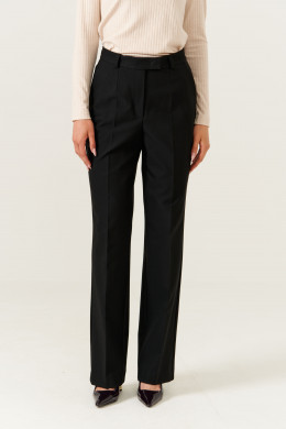 Брюки женские прямые из поливискозной ткани для повседневной носки. Верхний срез брюк обработан притачным поясом, застежка на один крючок, а также имеется застежка на тесьму-молнию в среднем шве брюк. В брюках имеются шлевки, что дает возможность носить их под ремень. Задняя часть брюк имеет две талиевые вытачки, а также два прорезных кармана в рамку с двумя обтачками. В брюках расположен в боковом шве карман с подкройным бочком. Отличный вариант брюк в классическом черном цвете, которые будут гармонично смотреться с любыми изделиями. В данных брюках вам будет очень комфортно и тепло за счет имеющегося начеса. Отличные базовые брюки в холодную погоду.