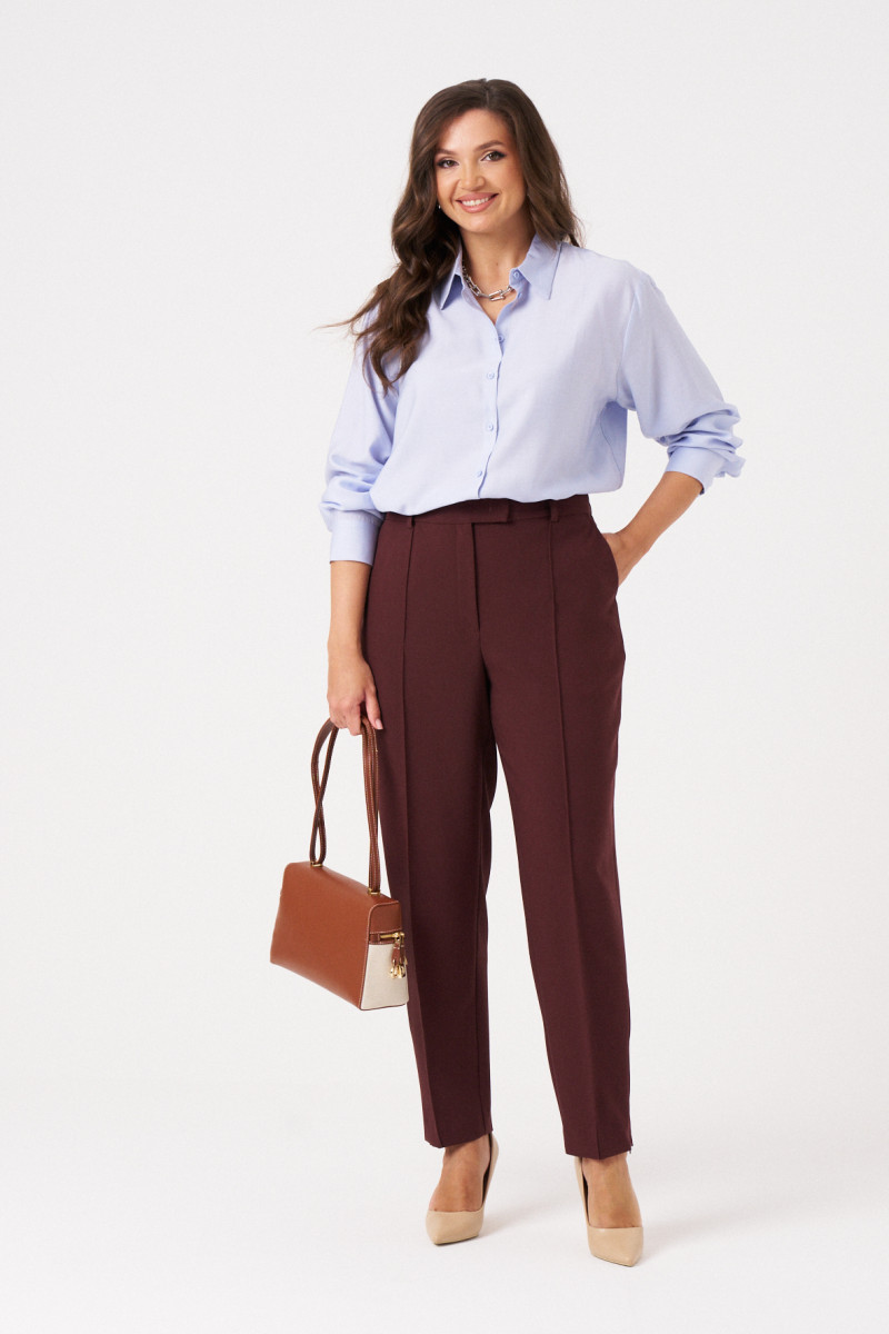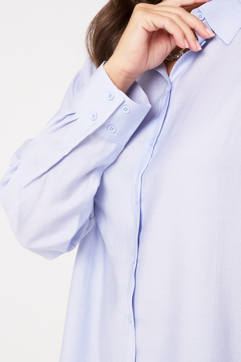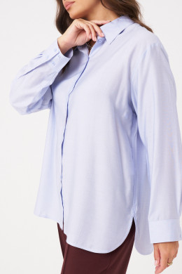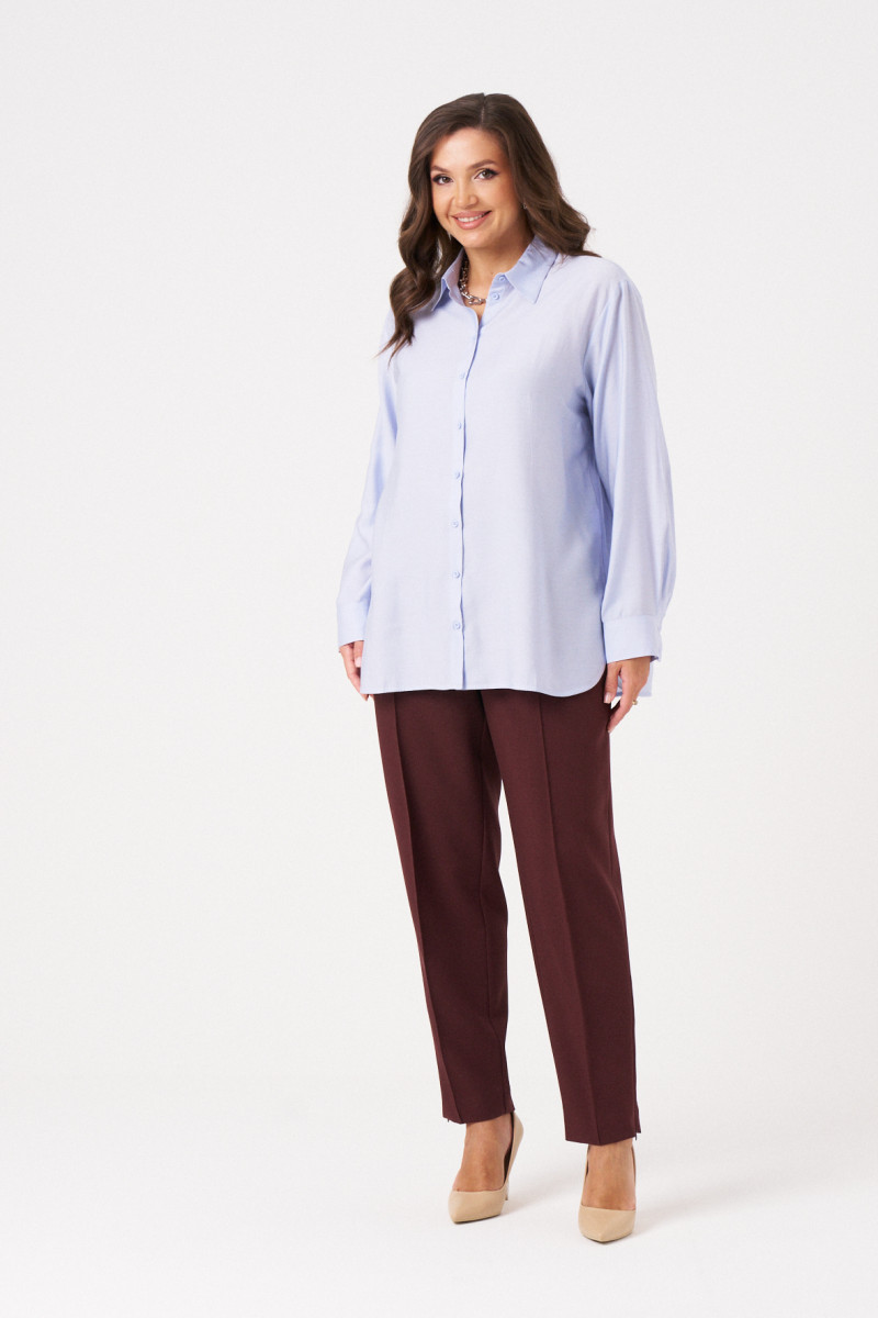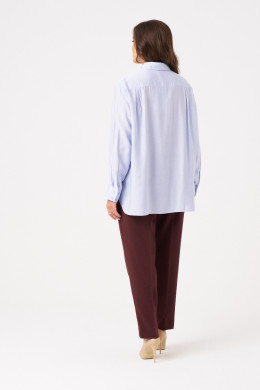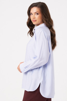 Эта женская блузка выполнена из легкой и воздушной поливискозной ткани с добавлением шерсти, что обеспечивает приятную мягкость и комфорт при носке. Ее голубой оттенок делает образ нежным и универсальным, идеально подходящим для повседневных ситуаций. Застежка центральная бортовая на обметанные петли и пуговицы обеспечивает удобство и аккуратный внешний вид. Низ переда выполнен в полукруглой форме, а спинка украшена кокеткой и складками, что добавляет изящества. Низ спинки также полукруглый, а боковые швы оснащены разрезами для дополнительного комфорта и стиля. Горловина оформлена рубашечным воротником с отрезной стойкой, придавая образу классический вид. Длинные втачные рукава завершены притачными манжетами с застежками на обметанные петли и пуговицы, что позволяет регулировать их длину и создавать аккуратный силуэт. Эта блузка идеально подойдет для создания повседневных образов — она сочетает комфорт, стиль и женственность, позволяя выглядеть элегантно в любой ситуации.