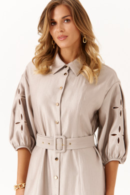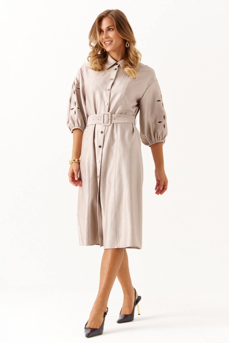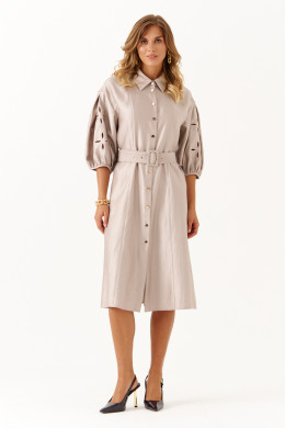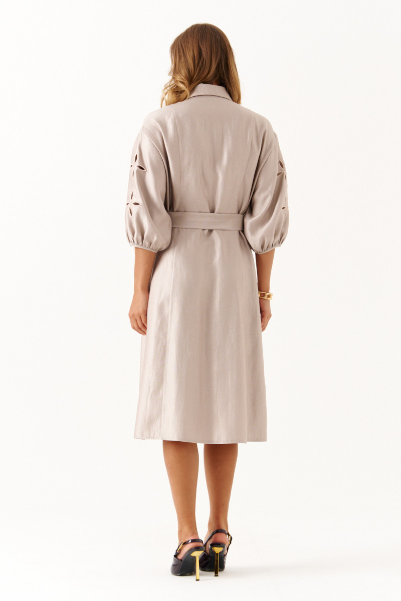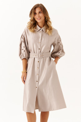 Это платье из смесовой ткани с высоким содержанием вискозы, выполненное в полуприлегающем силуэте. Модель с центральной застежкой на пуговицы с обметанными петлями. Передняя часть украшена двумя вертикальными рельефами, идущими от линии плеча до низа, что создает интересный визуальный эффект. Спинка также оформлена двумя вертикальными рельефами от плеча до линии низа. Талия подчеркнута шлёвками, позволяющими регулировать посадку или использовать пояс. Горловина оформлена рубашечным воротником с отрезной стойкой, придающей образу классический стиль. Рукава втачные, украшены красивым цветочным узором с перфорацией в виде лепестков, а нижняя часть рукава обработана притачной тесьмой со сборкой, добавляющей декоративности. Длина платья — миди, что делает его универсальным, за счет своего бежевого оттенка оно становиться элегантным и подходи для различных случаев.