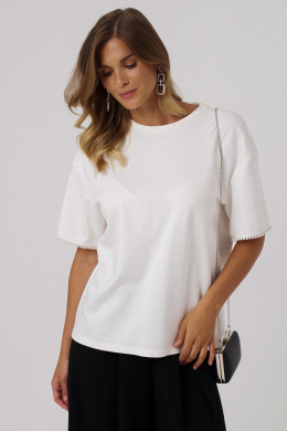 Женский джемпер молочного цвета из мягкого трикотажного полотна, созданный для комфортной повседневной носки. Модель характеризуется удобной посадкой и современным дизайном. Чуть расширенная горловина обеспечивает свободу движений и ощущение легкости, а немного опущенная линия плеча придает образу расслабленность и актуальность. Рукава втачные, длиной до локтя, низ рукава украшен декоративной тесьмой с бусинами, добавляющей изящный акцент. Этот джемпер станет прекрасным выбором для создания уютных и стильных повседневных образов.
