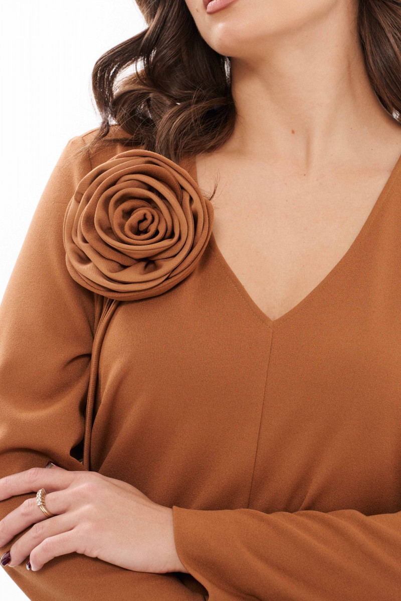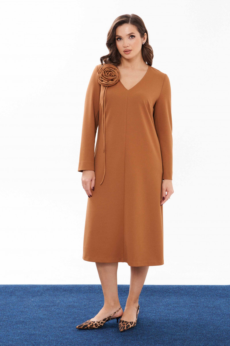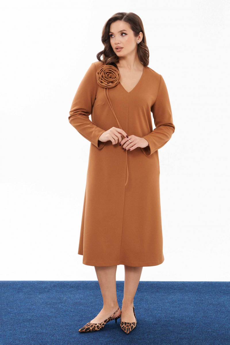 Платье женское из струящейся ткани для повседневной носки. Платье прямого силуэта. Перед имеет две нагрудные вытачки и средний шов. Спинка со средним швом. В боковом шве имеются потайные карманы. Горловина V-образная. Рукава втачные длинные с небольшими разрезами в шве по низу рукава. В качестве декора имеется красивое съемное дополнение в виде цветка-броши или на завязке в зависимости от удобства. Длина платья миди. Этот нежный вариант платья будет очаровывать всех своим чудесным видом, а на фигуре оно будет смотреться легко и изящно.