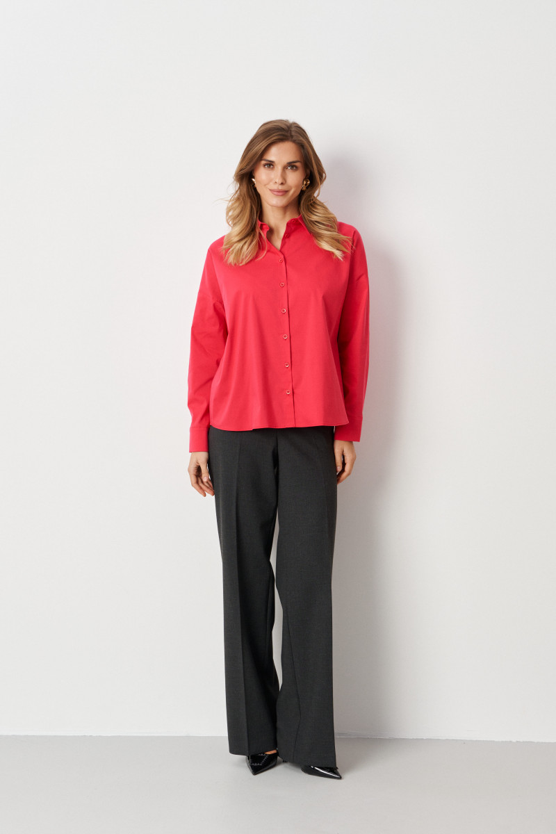Блузка офисная свободного кроя со спущенной линией плеча. Перед с воротником-стойкой и V-образным вырезом, подчеркнутым блестящими пуговицами на центральной застежке. Блузка летняя женская украшает аккуратный закругленный низ, разрезы в боковом шве и удлиненная спинка с пришивной кокеткой и складкой. Это обеспечивает идеальную посадку на плечах.
