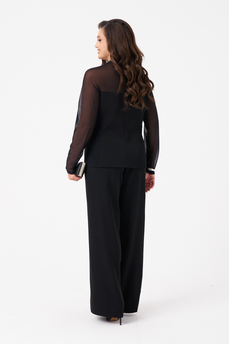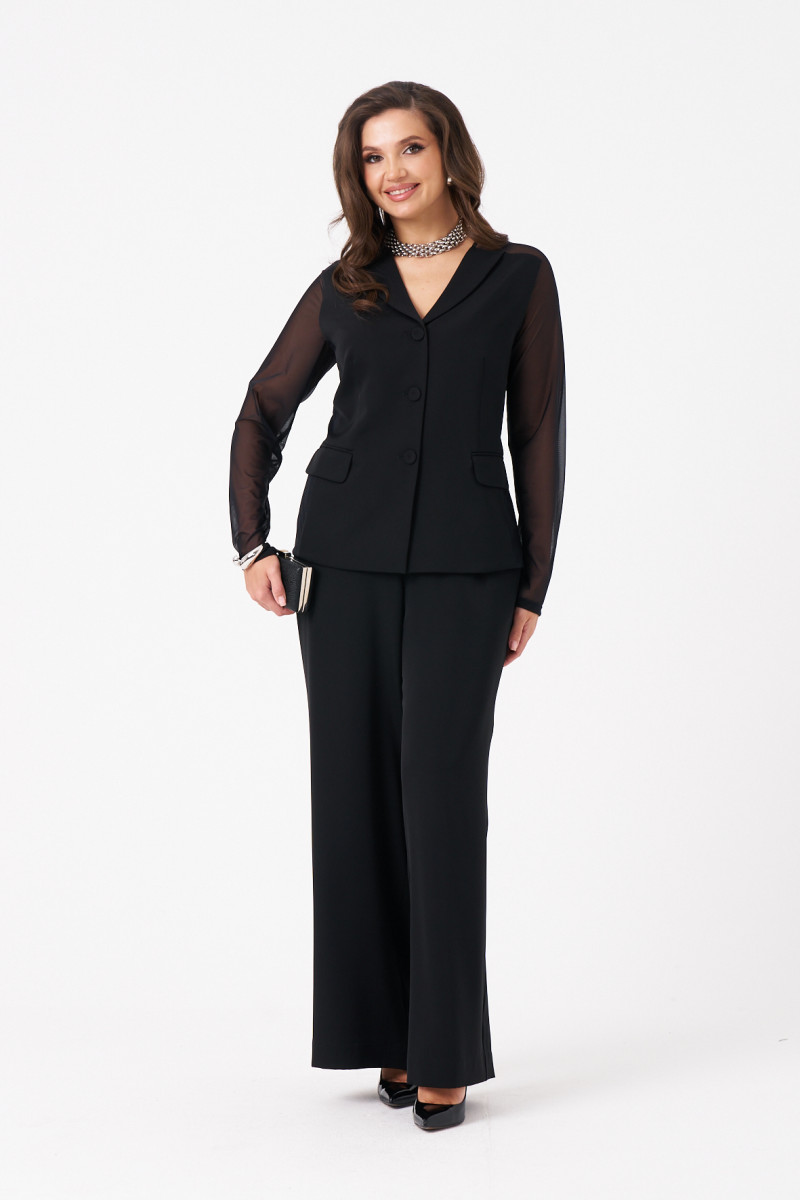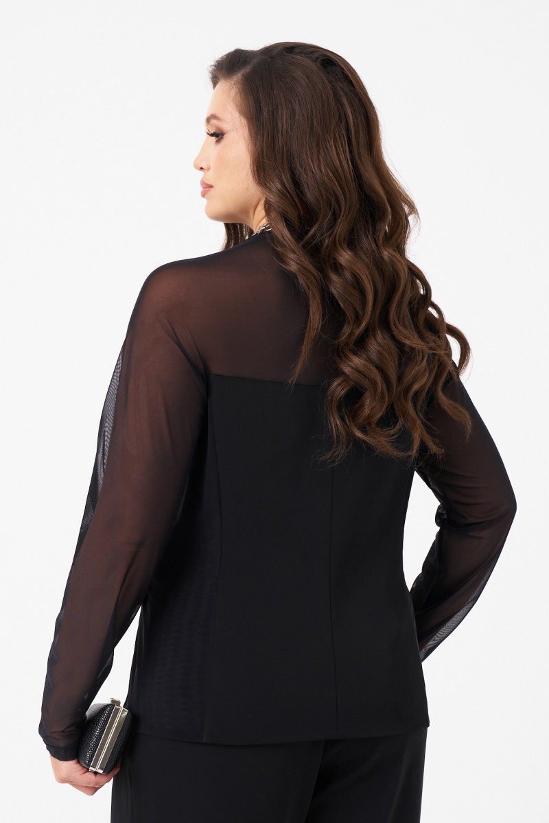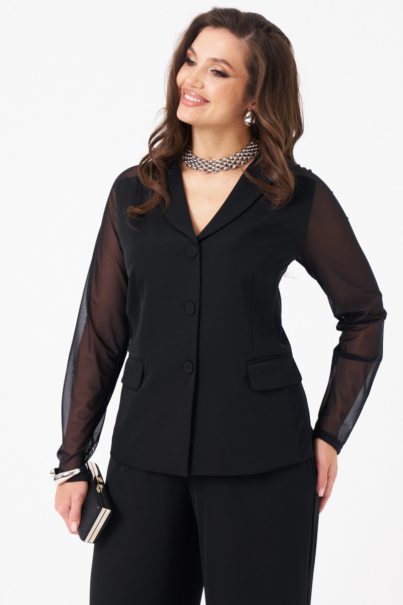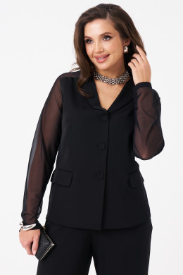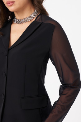 Это женский жакет из сочетания легкой костюмной ткани и сетки, выполненный в прилигающем силуэте. Модель отличается элегантным и утонченным дизайном, подходящим как для повседневных, так и для торжественных образов. Цвет жакета — насыщенный черный, что делает его универсальным и стильным элементом гардероба. Центральная бортовая застежка на обметанные петли и пуговицы, создающая аккуратный внешний вид. Передняя часть украшена двумя прорезными карманами с листочками, добавляющими функциональности и декоративности. По переду расположены две талиевые вытачки, подчеркивающие фигуру и создающие стройный силуэт. Спинка оформлена со средним швом и кокеткой из сетчатого материала, придающей образу легкость и оригинальность. Горловина обработана воротником-шаль, мягко обрамляющим плечи. Длинные рукава выполнены из сетчатого материала, гармонично сочетающегося с основной тканью жакета. Модель оснащена эластичной подкладкой для комфортного ношения.