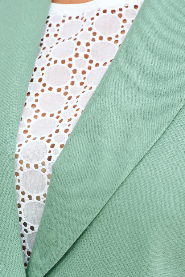 | 46 | Жакет: Длина изделия - 84см, Длина рукава - 61.5см, Ширина плеча - 13см, Ширина по бедрам - 56см, Ширина по груди - 51см, Ширина рукава - 18.5см; Брюки: Высота посадки - 29см, Длина брюк без пояса - 106.5см, Длина по внутреннему шву - 81см, Ширина брючин сверху - 88см, Обхват брюк по низу - 98см, Ширина по бедрам - 54см, Ширина по талии - 35см; |