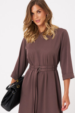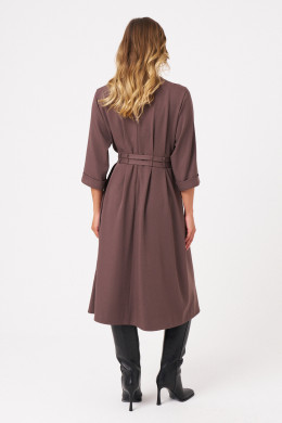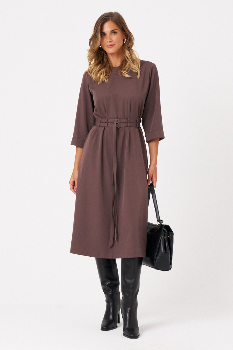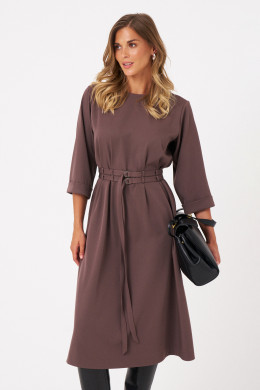 Это женское платье из поливискозной ткани идеально подходит для повседневной носки. Модель отличается комфортным кроем и стильным дизайном. Перед платья украшен защипами и шлевками, что позволяет просовывать два ряда поясов для создания разнообразных образов и акцентов. Спинка выполнена со средним швом и также украшена защипами и шлевками, а в среднем шве расположена застежка на тесьму-молнию для удобства надевания. Горловина чуть расширенная, придающая образу легкую элегантность. Рукава втачные, чуть ниже локтя, завершены отлетной манжетой, что добавляет изделию аккуратности и завершенности. А изящный коричневый оттенок платья позволяет его носить на различные случаи.