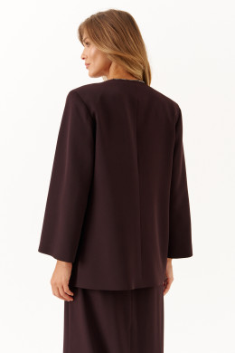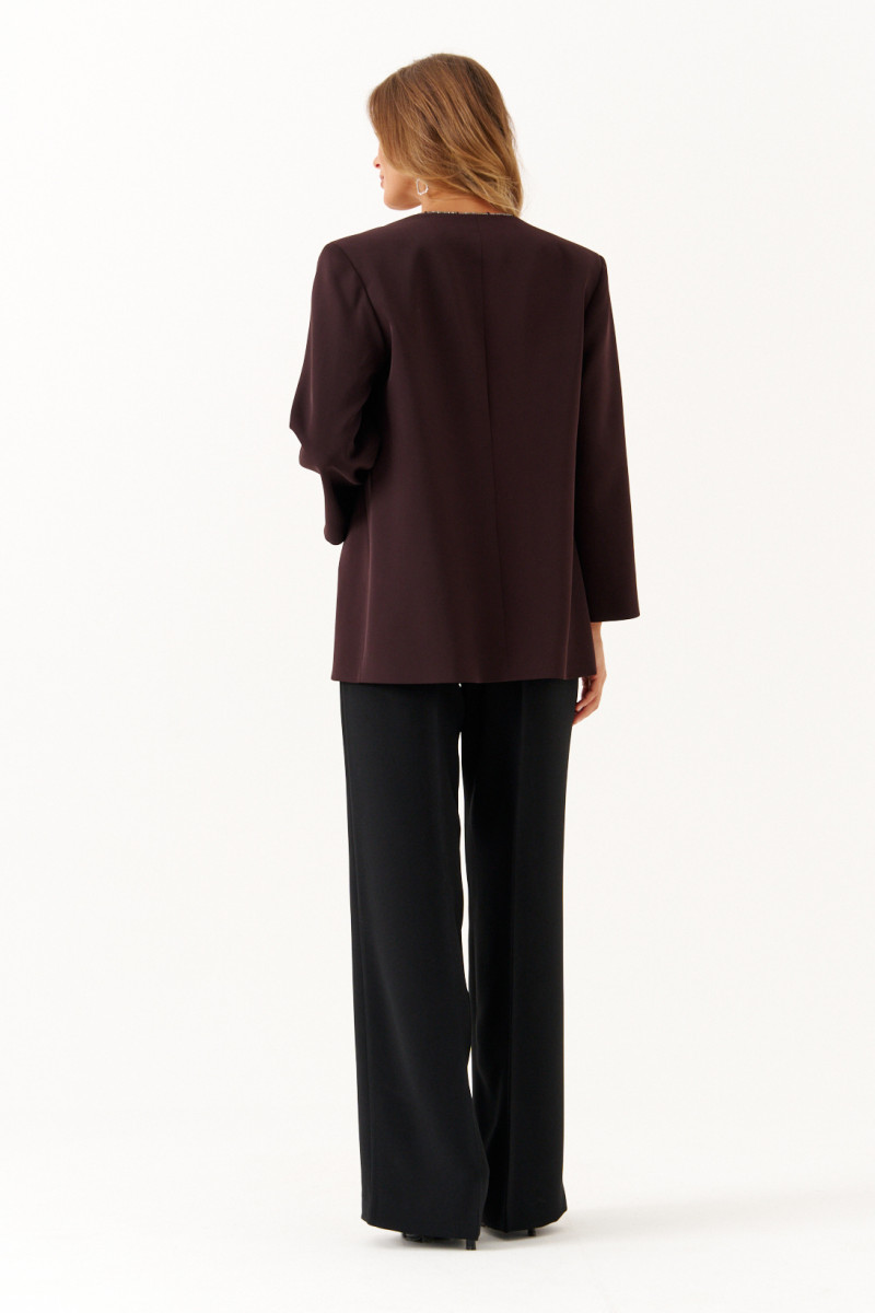 Жакет женский из легкой струящейся ткани, предназначенный для торжественных мероприятий. Модель выполнена в коричневом цвете и отличается элегантным кроем с двумя нагрудными вытачками на переде и средним швом на спинке, что обеспечивает идеальную посадку по фигуре. Край борта украшен декоративным шнуром со стразами, который плавно проходит вдоль V-образной горловины и борта, придавая изделию утонченность и изысканный блеск. Широкие втачные рукава добавляют свободу движения и стильный акцент. Этот жакет станет прекрасным дополнением к вечернему или праздничному образу.