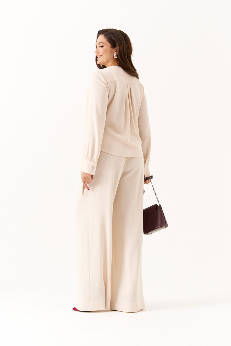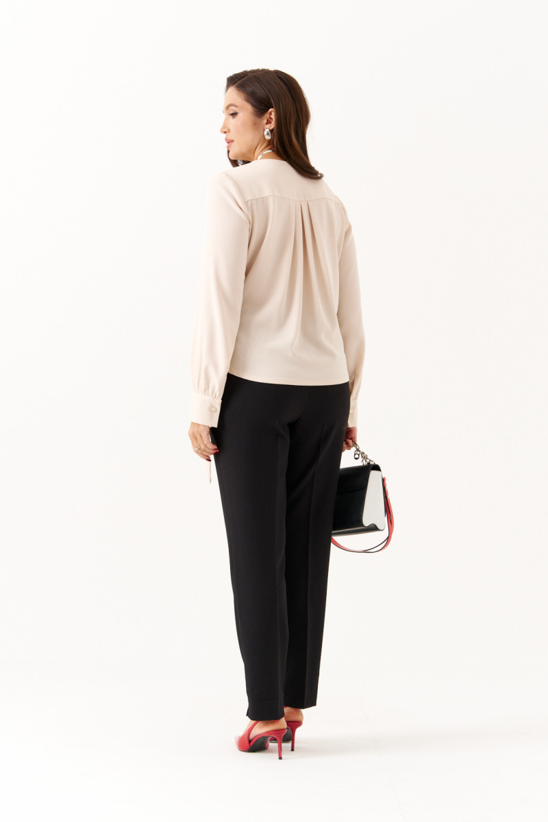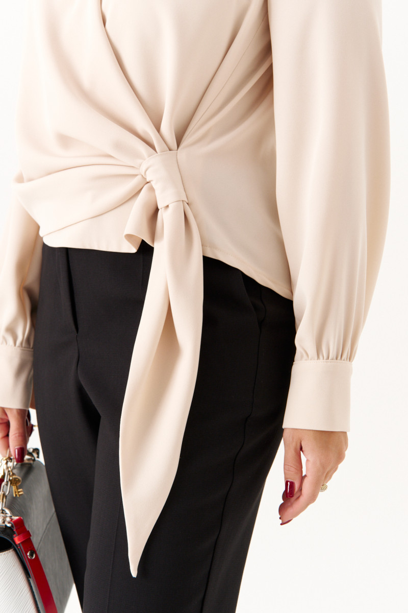 Женская блузка из струящейся ткани бежевого цвета, идеально подходящая для повседневной носки. Модель выполнена на запах, что придаёт ей элегантность и удобство. Передняя часть украшена складками в плечевом шве, а также дополнительными складками, образующимися за счёт передней детали, продеваемой через перемычку. Спинка имеет отрезную кокетку и небольшие складки для комфортной посадки. Горловина V-образная, подчёркивающая линию шеи. Рукава втачные, длинные. Низ рукава оформлен притачной манжетой с застёжкой на обмётанную петлю и пуговицу. Оригинальная и стильная блузка.