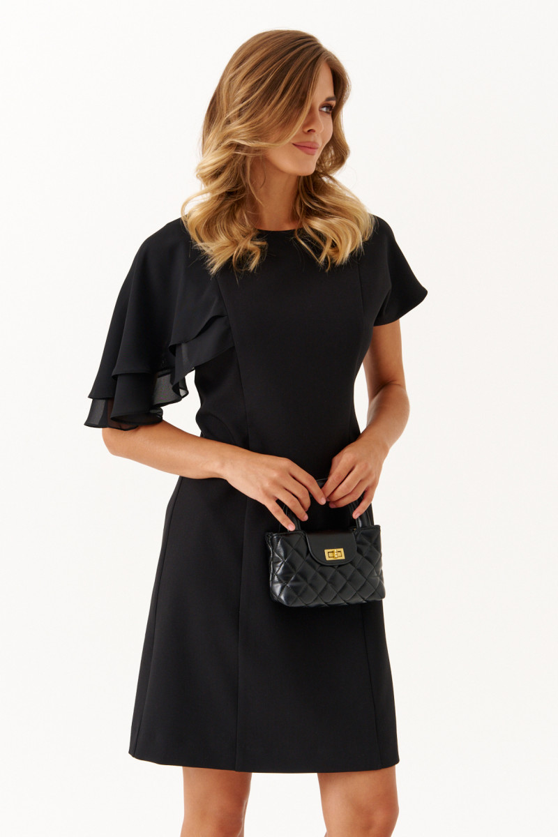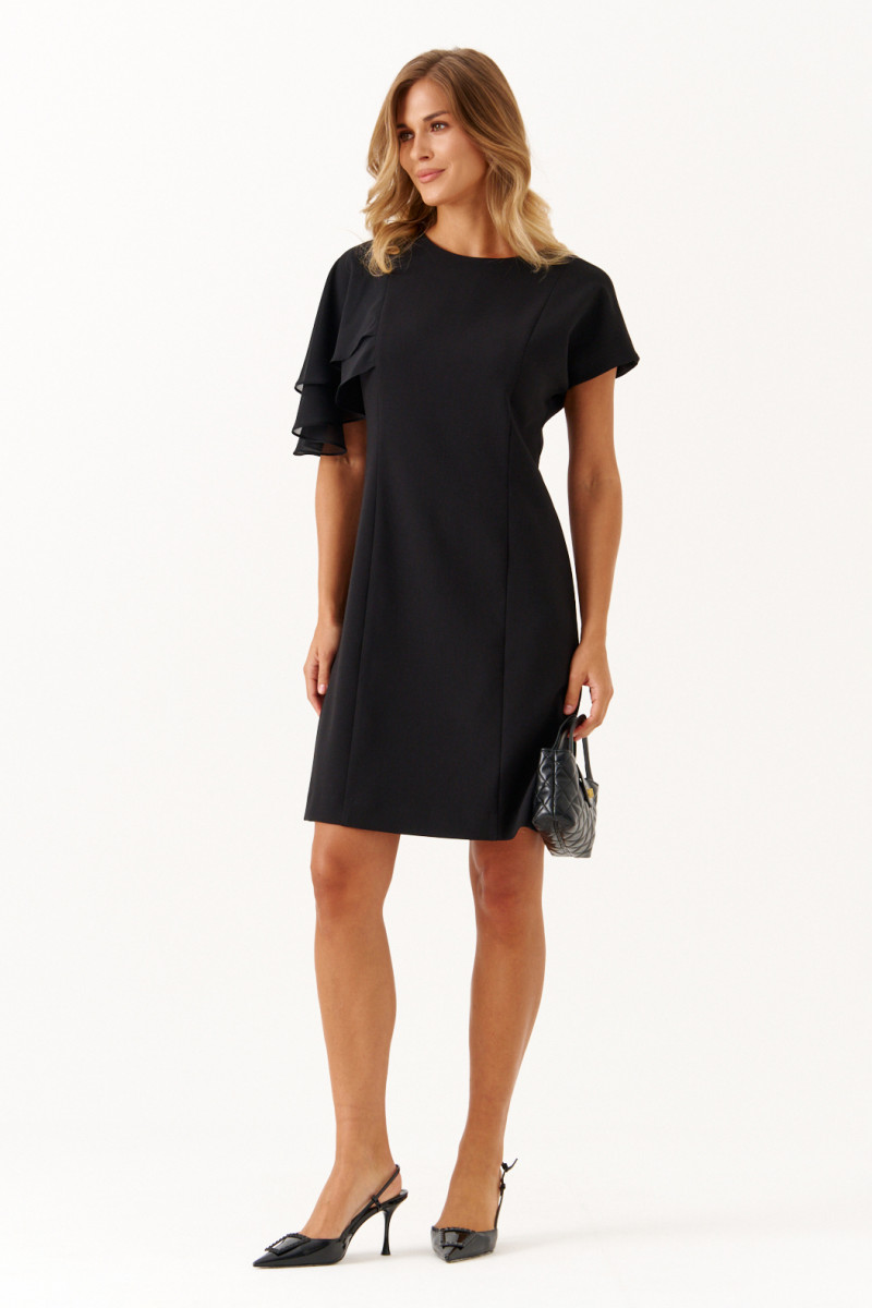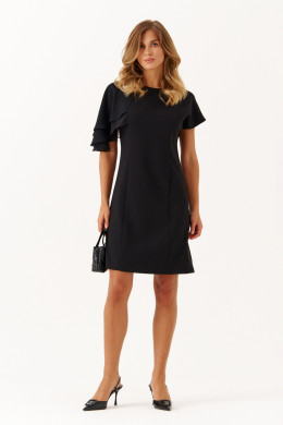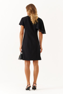 Стильное чёрное платье миди с оригинальными деталями. Это элегантное полуприлегающее платье из мягкой поливискозной ткани идеально подходит для повседневных и торжественных образов. Модель выполнена с выразительными рельефами по переду и спинке идущими от горловины до линии низа, создающими стройный силуэт. Спинка со средним швом и потайной застёжкой-молнией для удобства надевания платья. Платье с оригинальными деталями: одним коротким рукавом с воланами из струящейся ткани и другим коротким цельнокроеным рукавом, подчеркивающим универсальность и комфорт. Расширенная горловина и лаконичный дизайн делают платье актуальным и женственным. Длина миди придает образу изысканность и легкую нотку романтики. Отличный выбор для тех, кто ценит стиль, комфорт и индивидуальность.