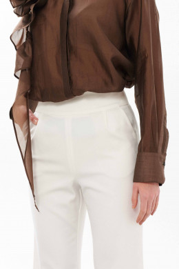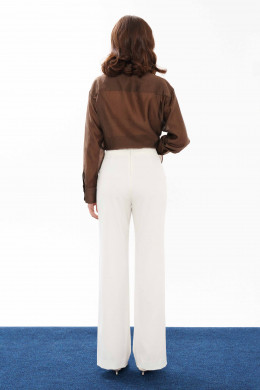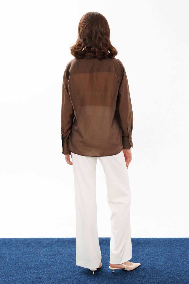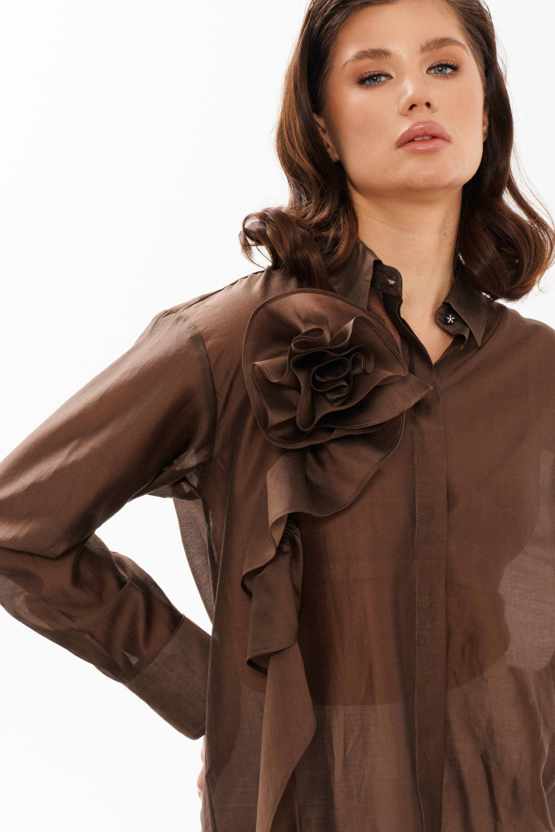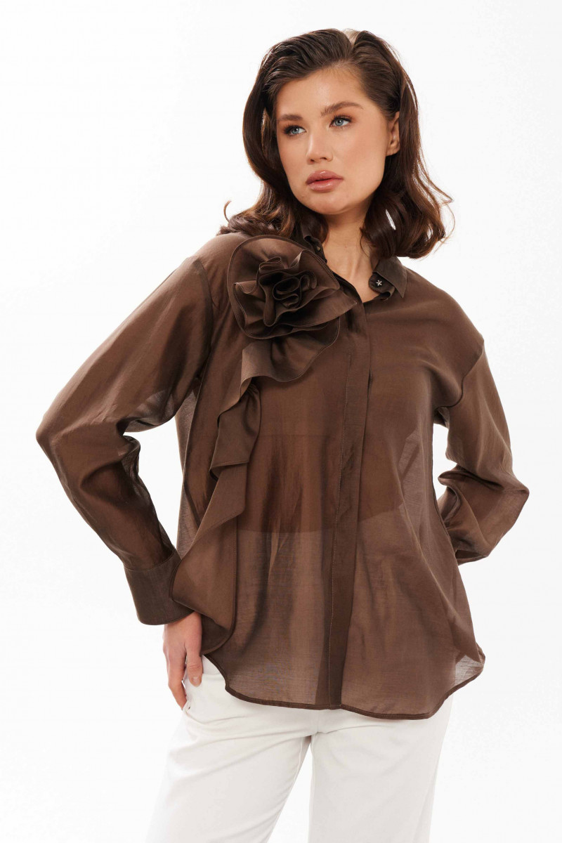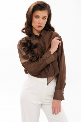 Блузка женская из смесовой ткани с большим содержанием хлопка. Застежка центральная бортовая на обметанные петли и пуговицы. В боковых швах имеются небольшие разрезы. Горловина обработана рубашечным воротником с отрезной стойкой. Рукава втачные длинные, низ рукава обработан притачной манжетой. К блузке в качестве декора идёт украшение-цветок в виде розы. Роза крепится на булавку. Данная блуза подойдёт для торжественных случаев либо для деловых всреч. Элегантная легкая блузка в модном коричневом цвете для женщины с утончённым вкусом.