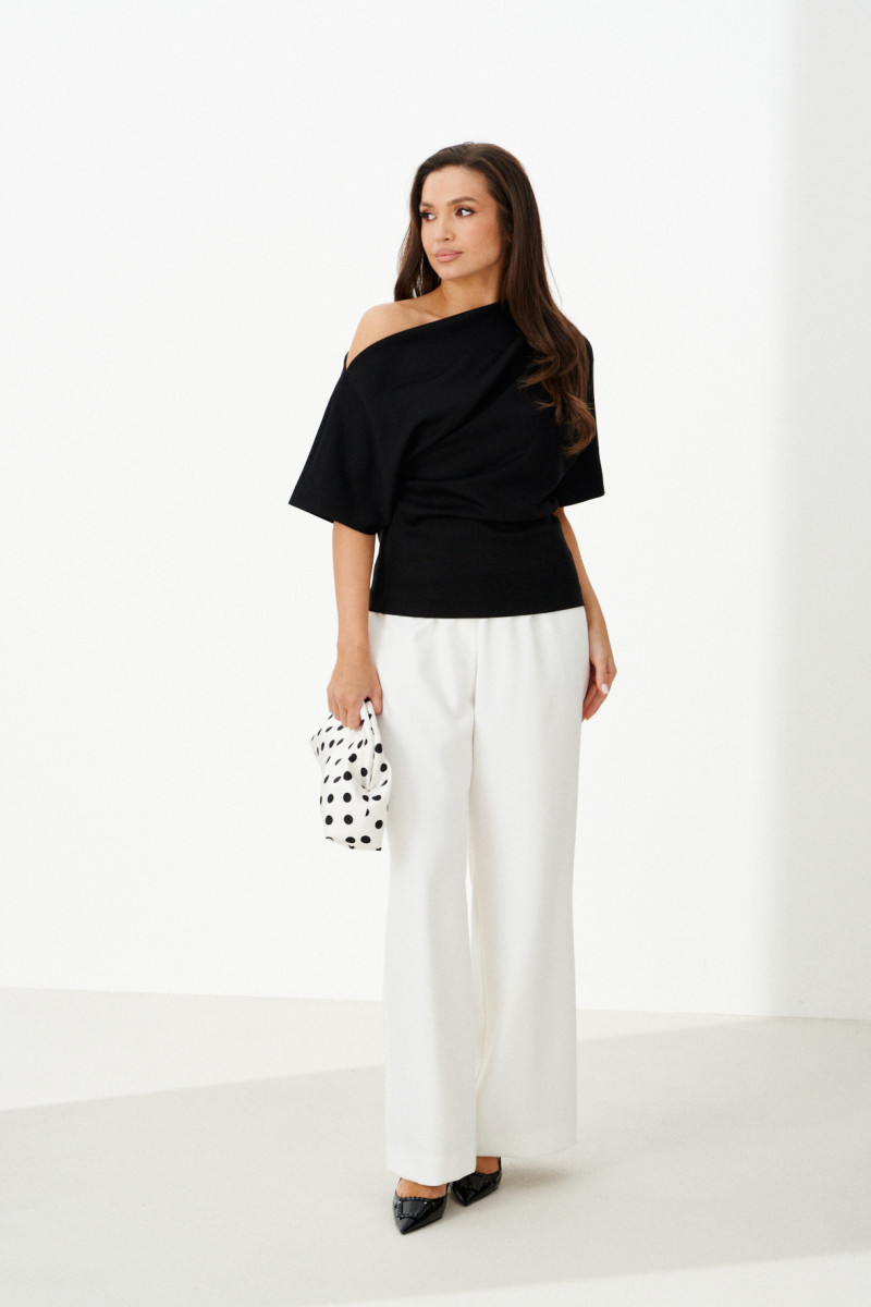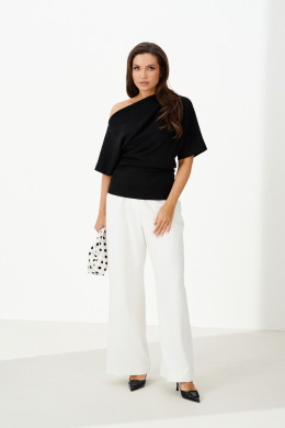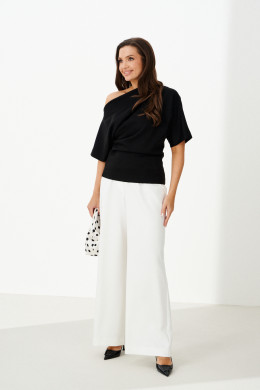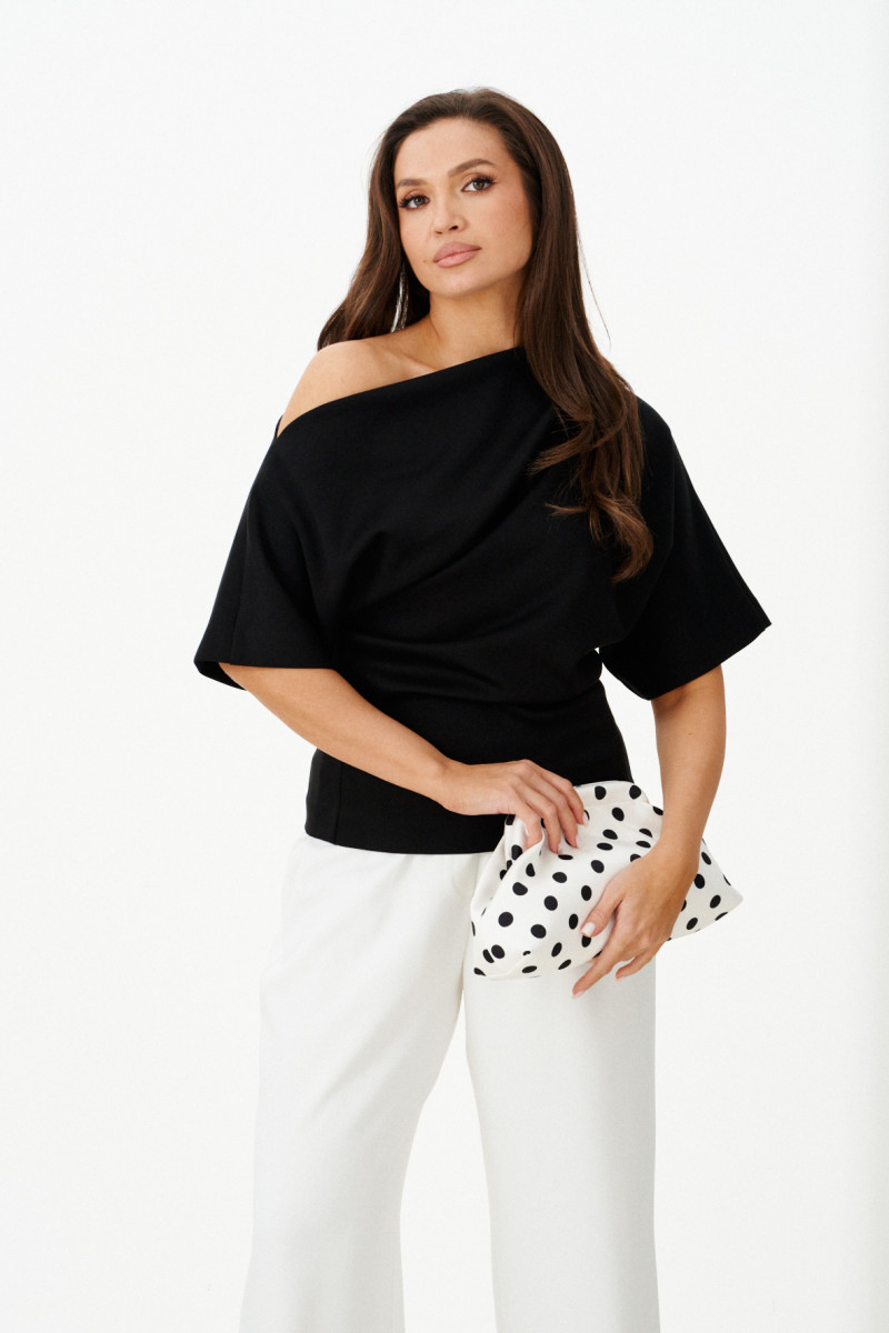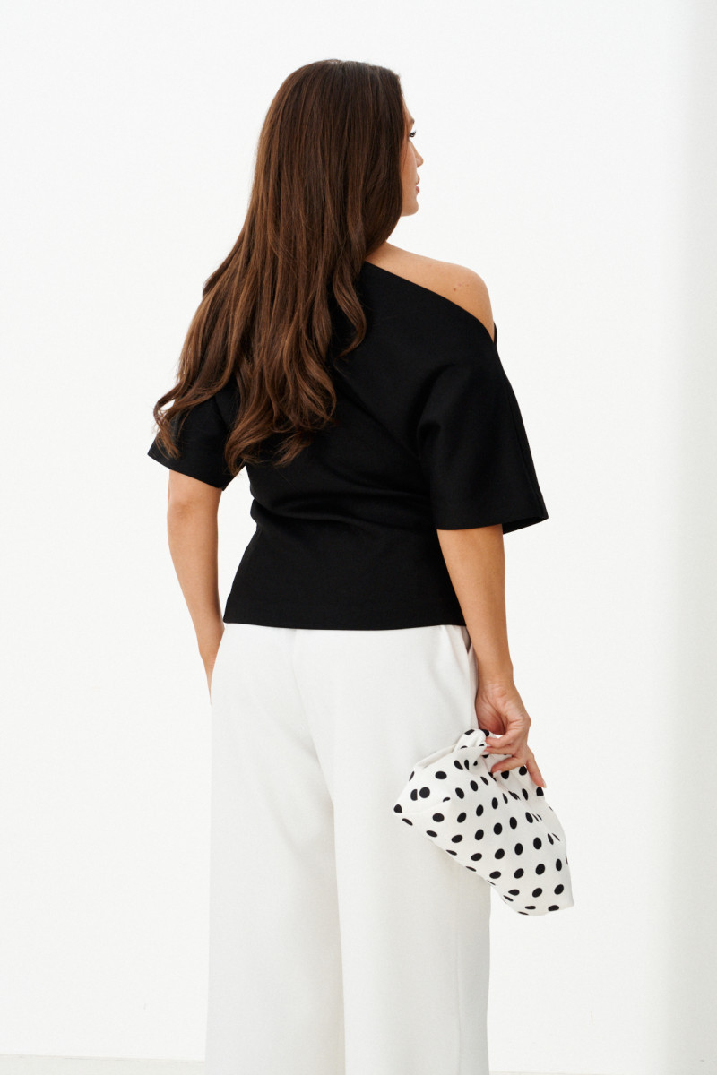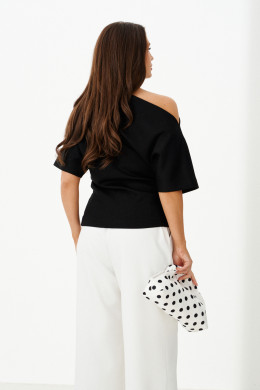 Женский джемпер чёрного цвета из мягкого трикотажа. Стильный джемпер асимметричного фасона выполнен из мягкого и комфортного трикотажного полотна. Модель длиной на уровне бедер отлично подходит для повседневной носки. Цельнокроеные рукава длиной до локтя и расширенная горловина придают изделию современный и легкий образ. Джемпер станет универсальным дополнением вашего гардероба, сочетая комфорт и оригинальный дизайн.