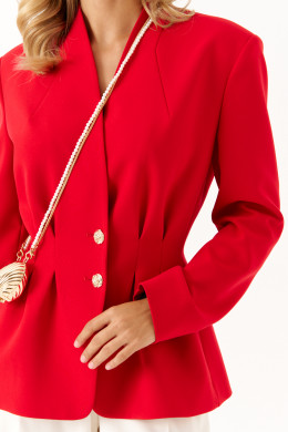 Жакет женский из поливискозной ткани красного цвета. Стильный жакет полуприлегающего силуэта, выполненный из качественной поливискозной ткани, идеально подходит для повседневной носки. Модель застегивается по центру на обметанные петли и пуговицы, что обеспечивает удобство и классический вид. Перед жакета украшен защипами по талии и плечевой вытачкой, а боковые детали (бочок) создают аккуратный силуэт. Спинка с средним швом дополнена защипами по талии для дополнительной посадки. V-образная горловина обработана подбортом — эта деталь подчёркивает элегантность модели. Длинные втачные рукава делают жакет универсальным вариантом для разных сезонов. Жакет выполнен на поливискозной подкладке для комфортного ношения.